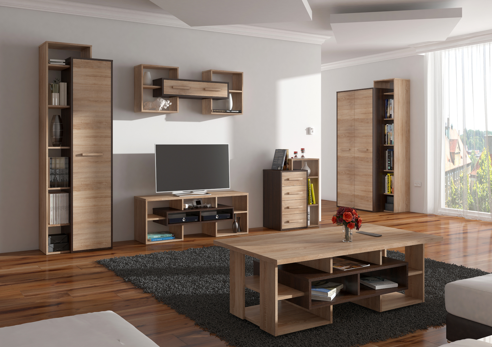 Obývací stěna Rio 2 se skládá z skříně L Rio 01, komody P4S Rio 09, police 1D Rio 15, TV stolku Rio 20.
