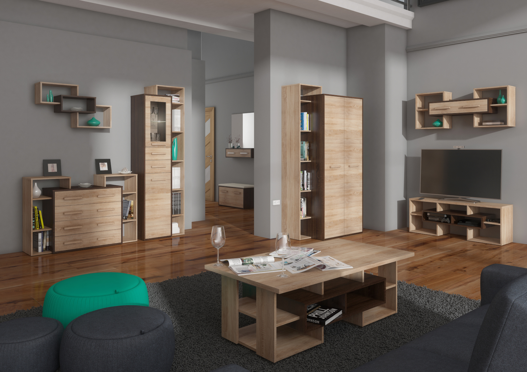 Obývací stěna Rio 4 nabízí - komoda 4S Rio 07, police 1D Rio 15, police M Rio 17, TV stolek Rio 20, skříň L2D Rio 22, vitrína P1D2S Rio 29.
