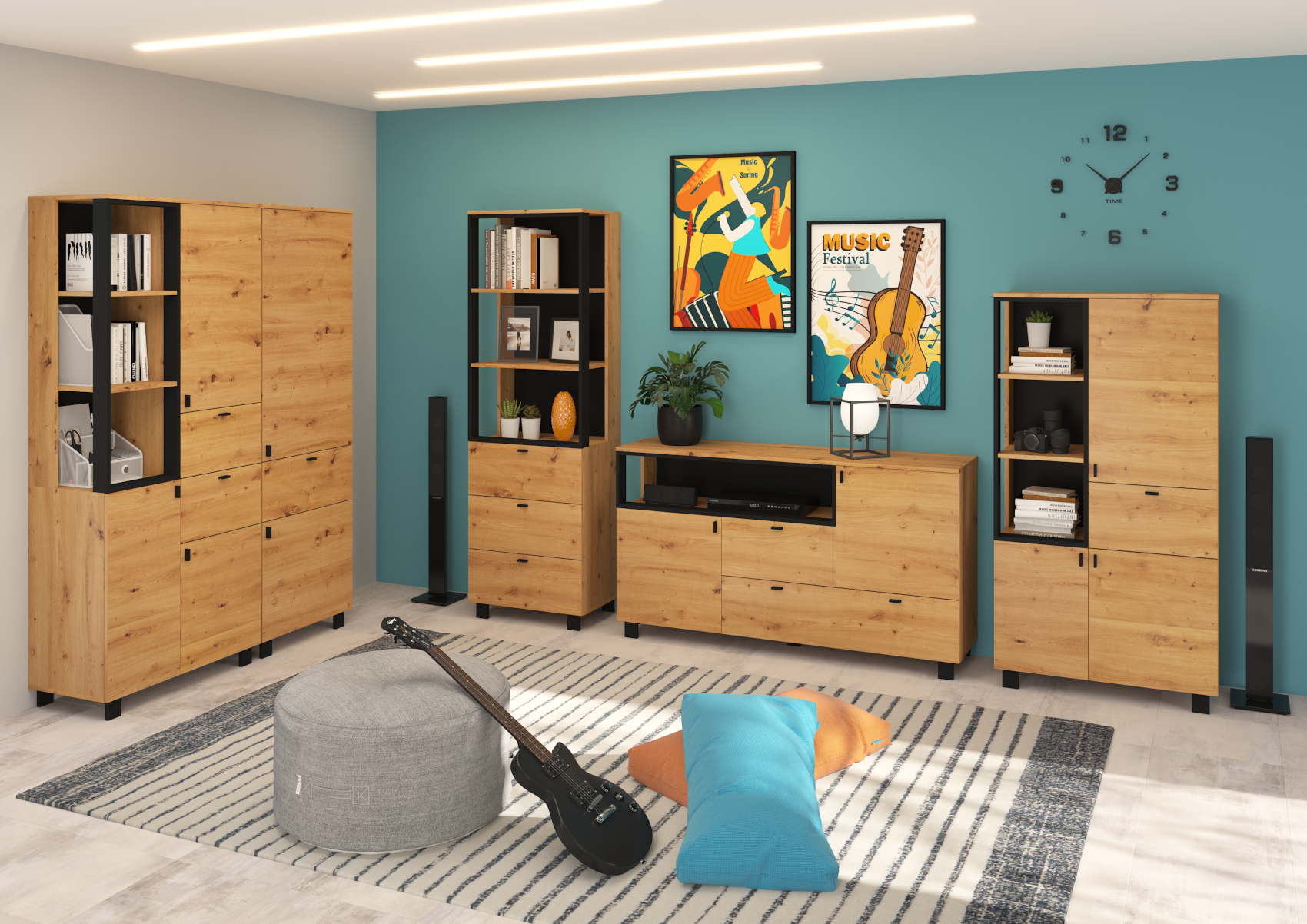 Obývací stěna Vegas vás zaujme svým moderním designem a přírodním provedením v kombinaci s černými či bílými detaily. Jednotlivé komodity jsou vyrobeny z kvalitních lamino desek o síle 16 mm. Desky mají ABS hranění, které zvyšuje odolnost pro odštípnutí hran. Součástí zásuvek a dvířek jsou jednoduché černé kovové úchyty, zároveň mají zabudovaný systém tichého dovírání. Nábytek stojí na černých kovových nožkách o velikosti 8 cm, které provzdušní váš celkový interiér. Nabízíme vám několik barevných variant.