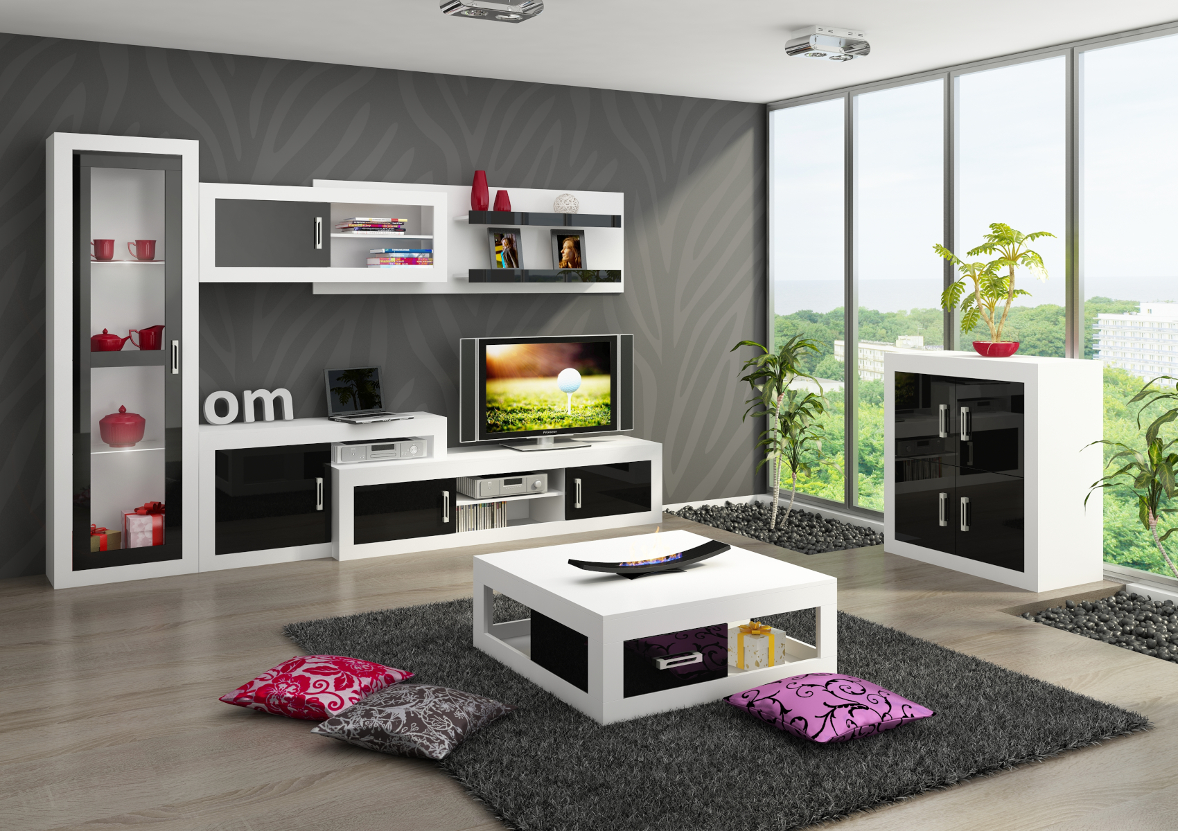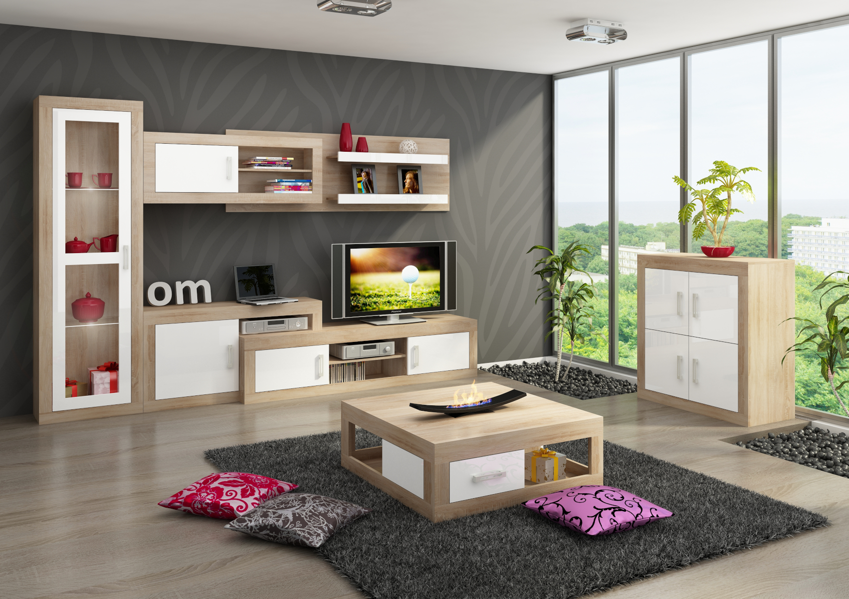 Cena sestavy Verin 3 zahrnuje: vitrínu Verin 08, regál nízký Verin 04, televizní stolek Verin 05, závěsnou skříňku Verin 07.