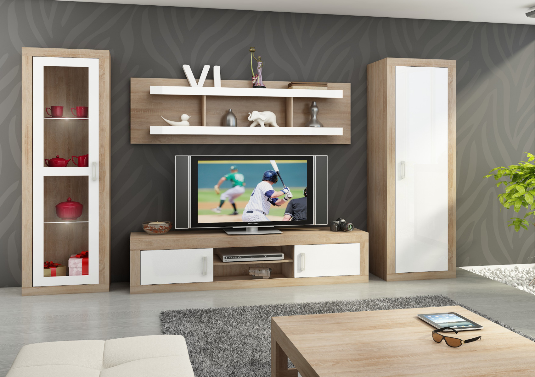 Cena sestavy Verin 4 zahrnuje: šatní skříň Verin 06, police Verin 03, televizní stolek Verin 05, vitrínu Verin 08.