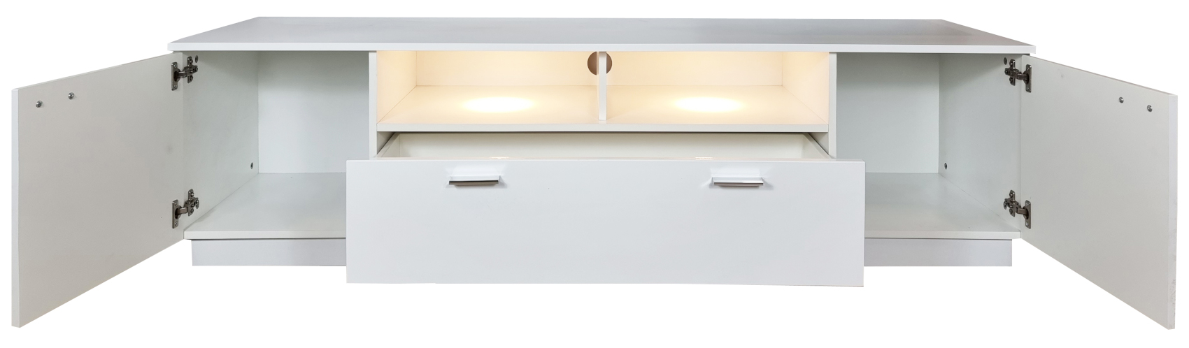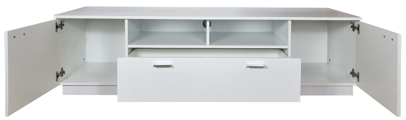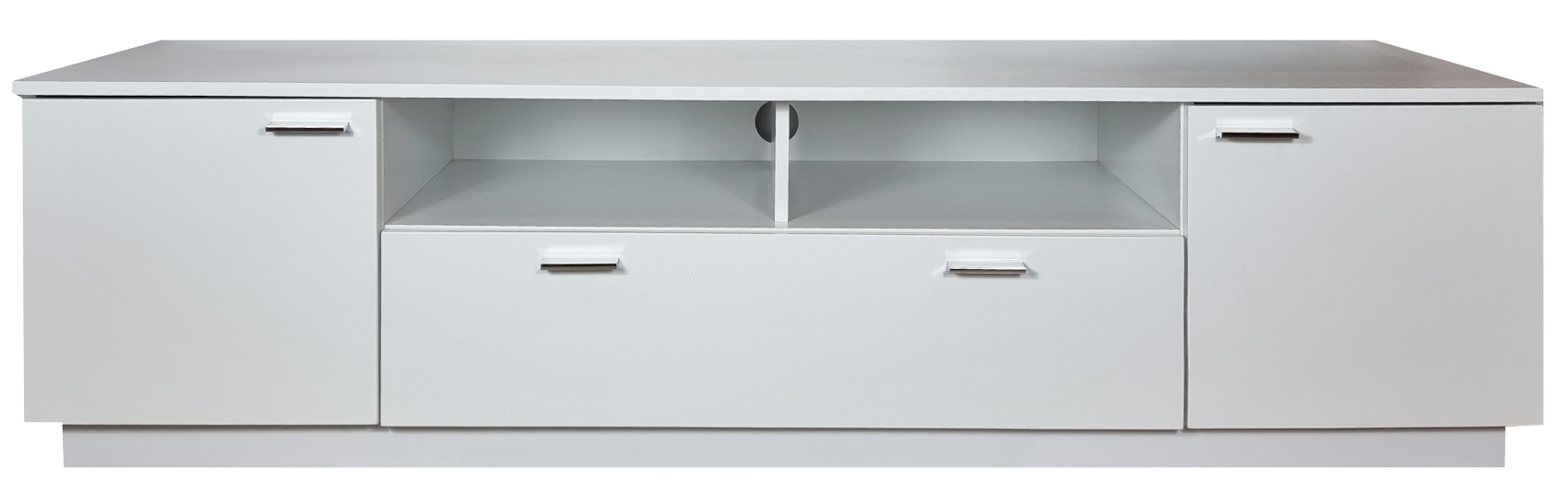 Obývací stěna Kloss vás zaujme svým jednoduchým a elegantním designem. Jednotlivé komponenty jsou vyrobeny z kvalitního lamina potaženého bílou fólií. Dvířka a zásuvky mají jednoduché bílé úchyty. Nábytek stojí na vyšším soklu.