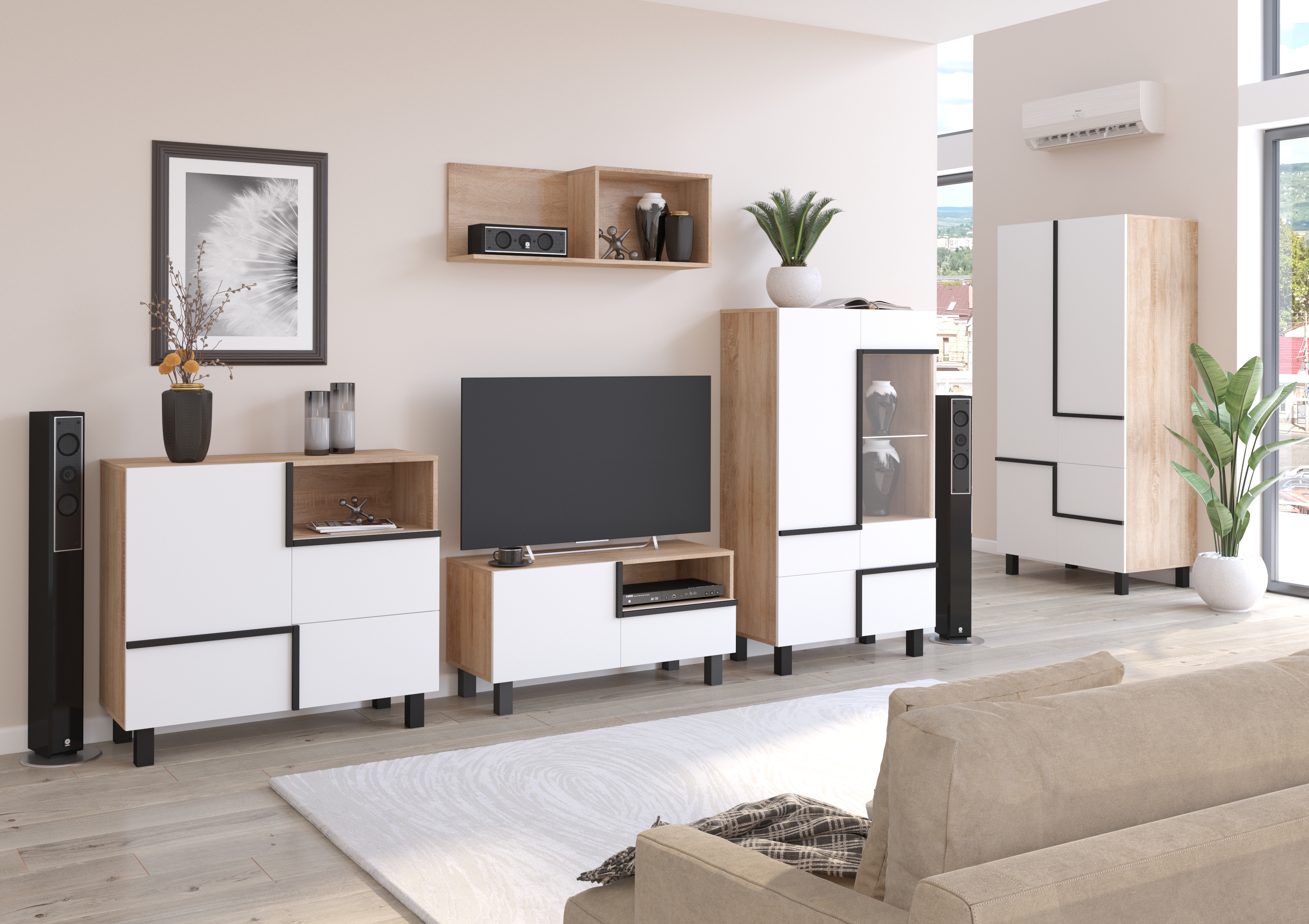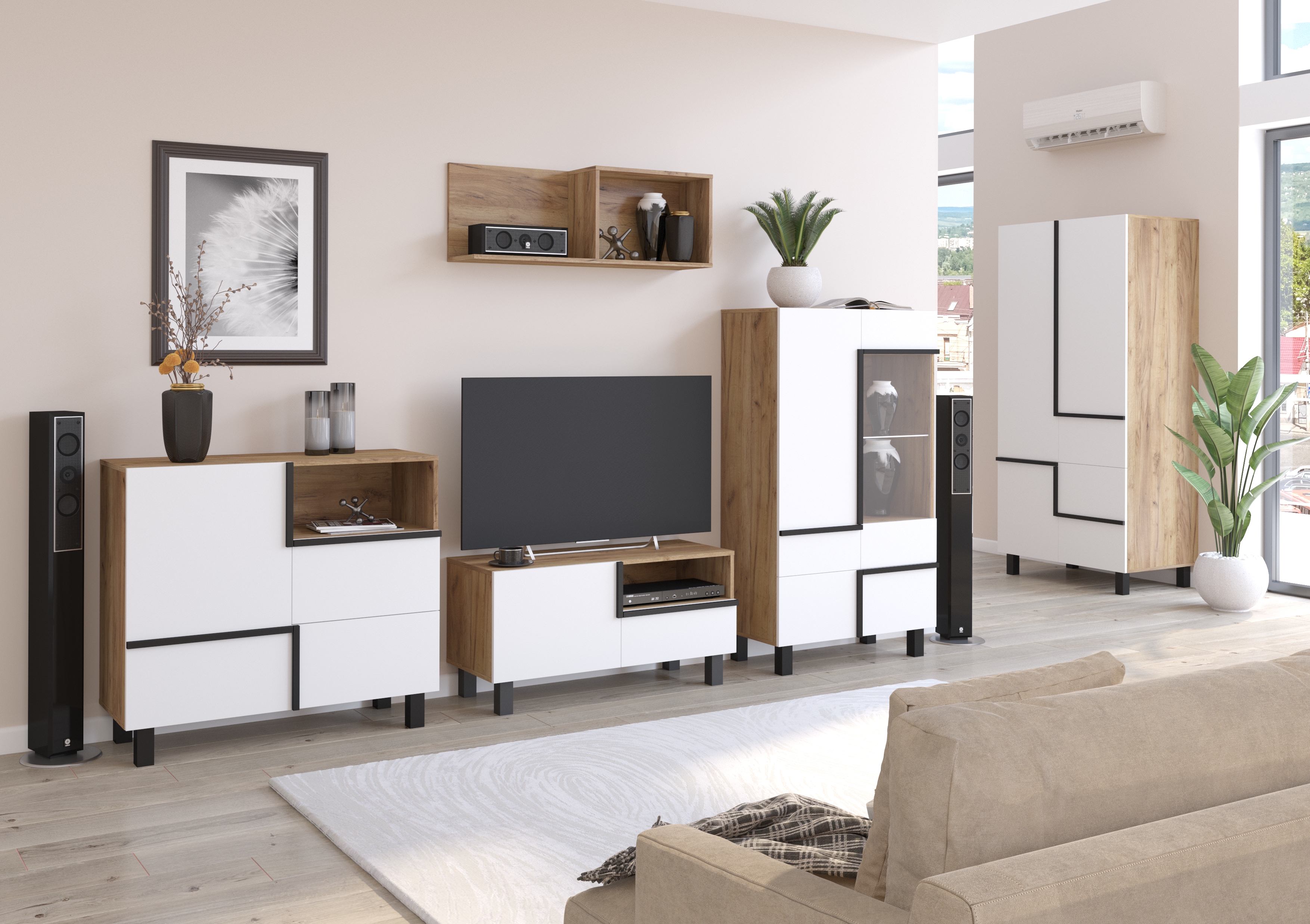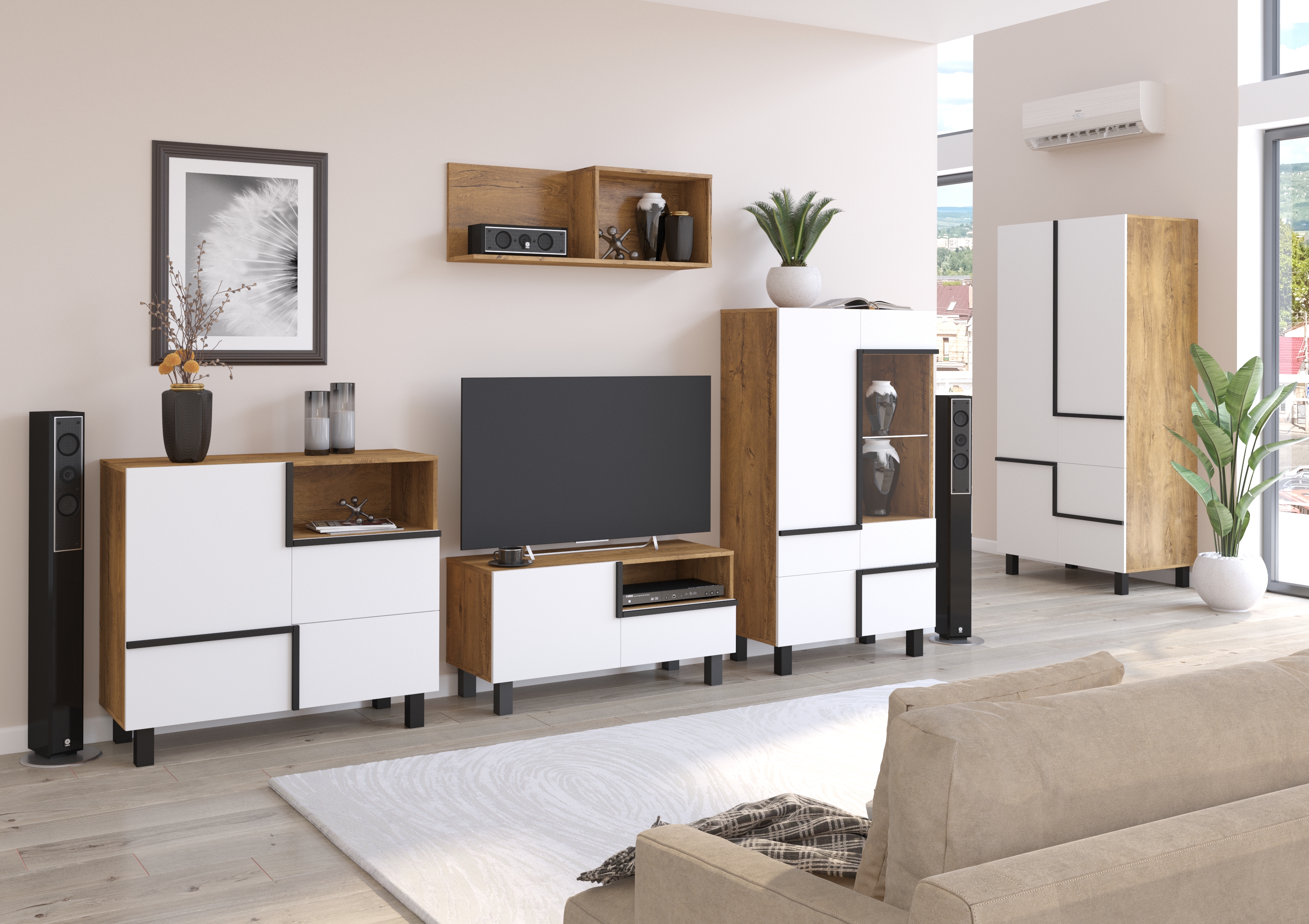 Vyobrazená skříň Lars 10 není součástí stěny, můžete si je ale doobjednat samostatně, či je zkombinovat s jinými prvky kolekce a vytvořit si tak obývák podle svých představ.