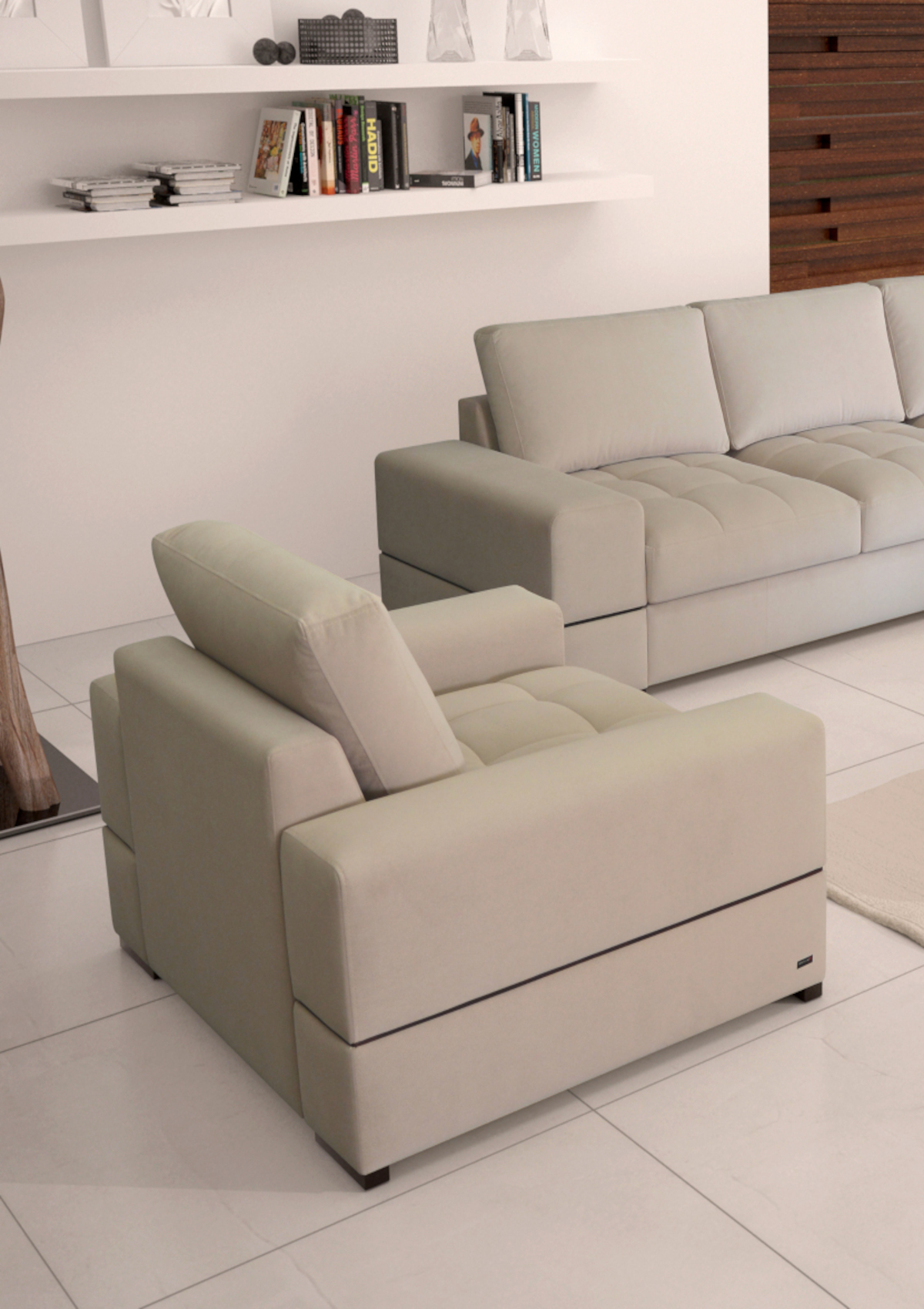Součástí je úložný prostor k uložení přikrývek. Křeslo stojí na nízkých chromových nožkách ve stříbrném odstínu.