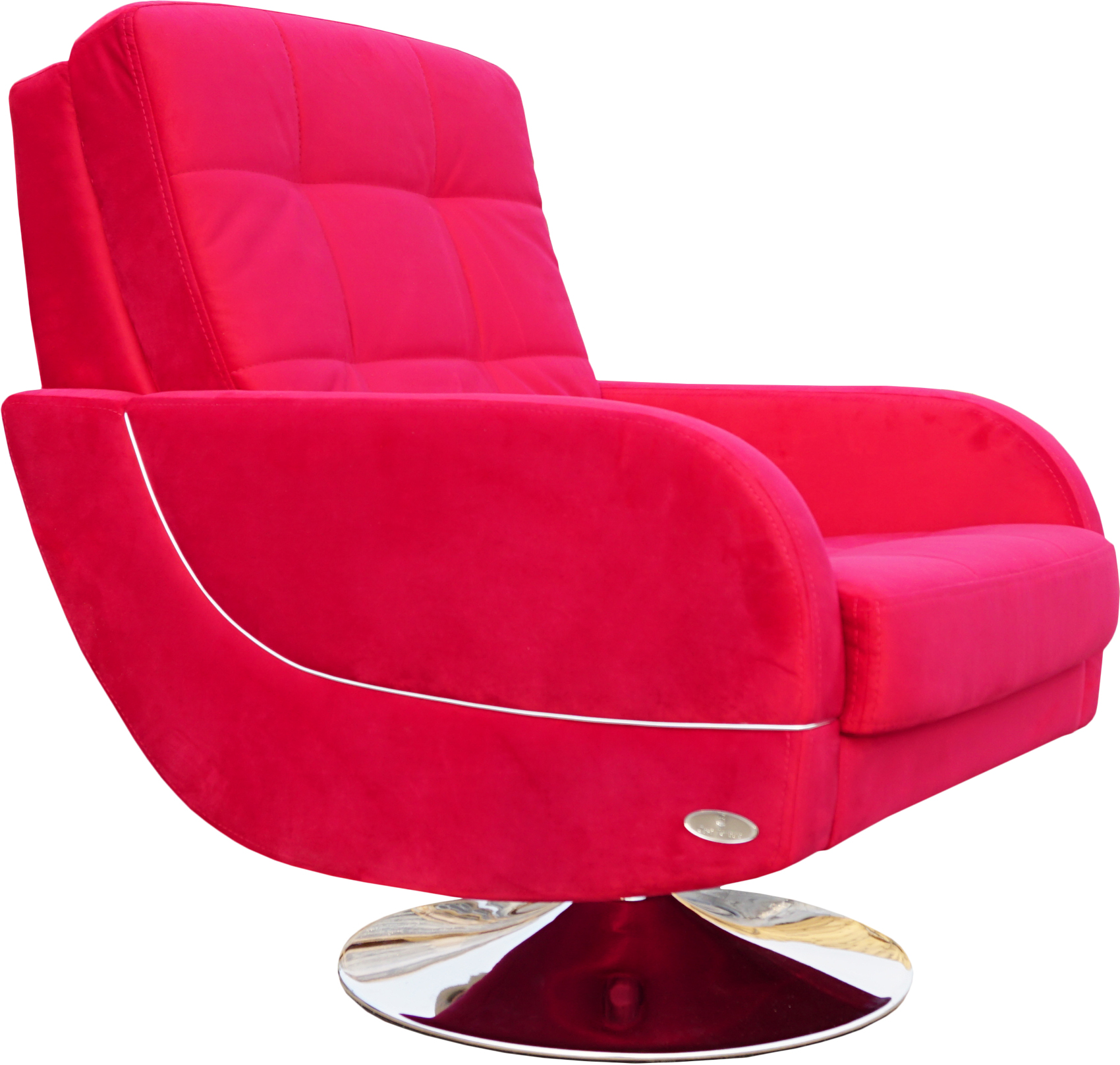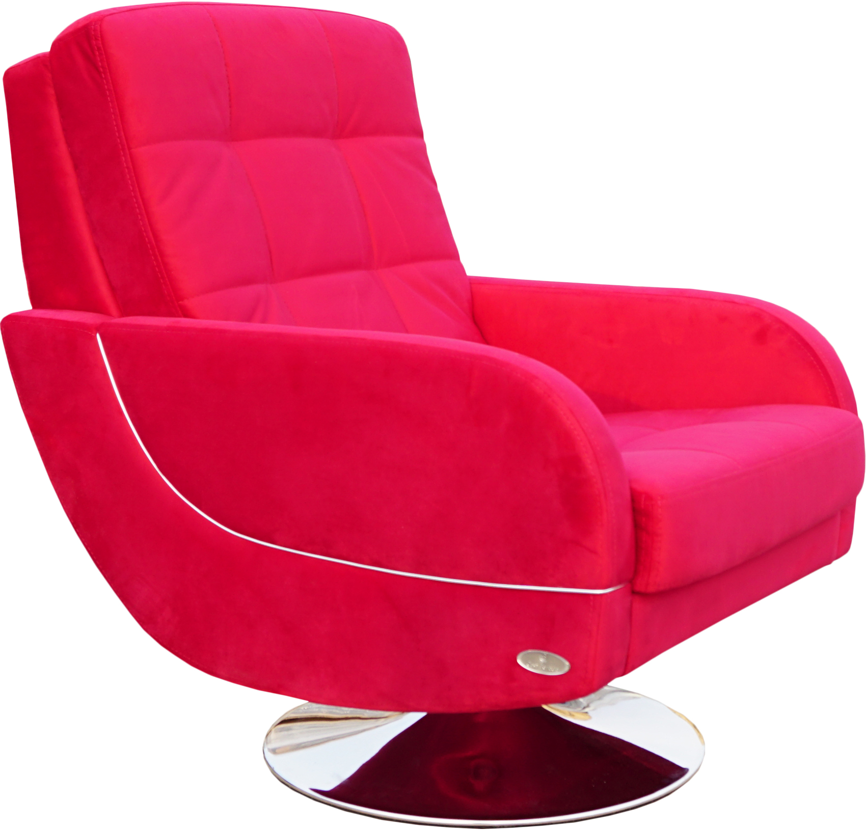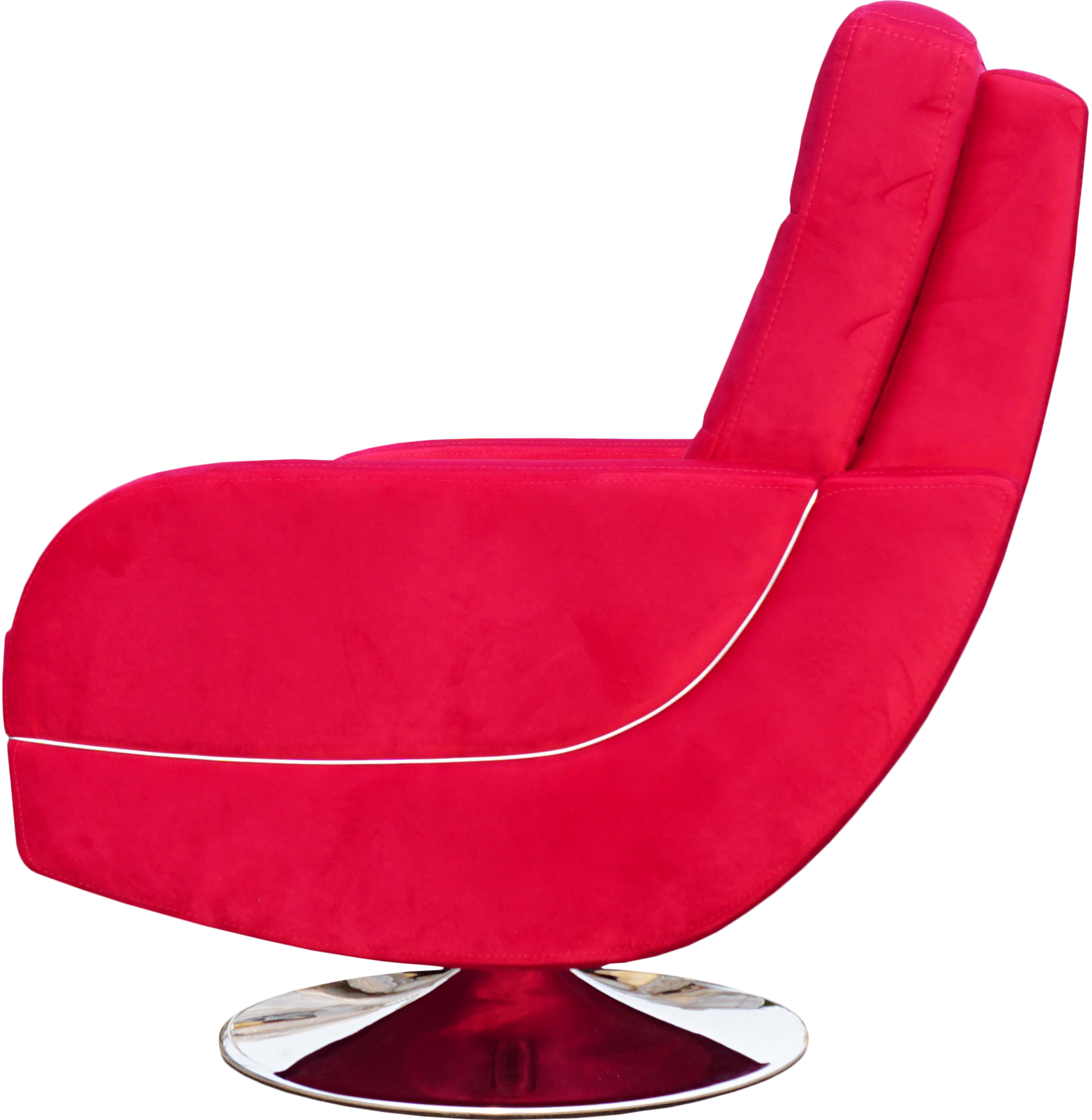 Sedačka stojí na otočné masivní kovové podnoži ve stříbrné barvě.