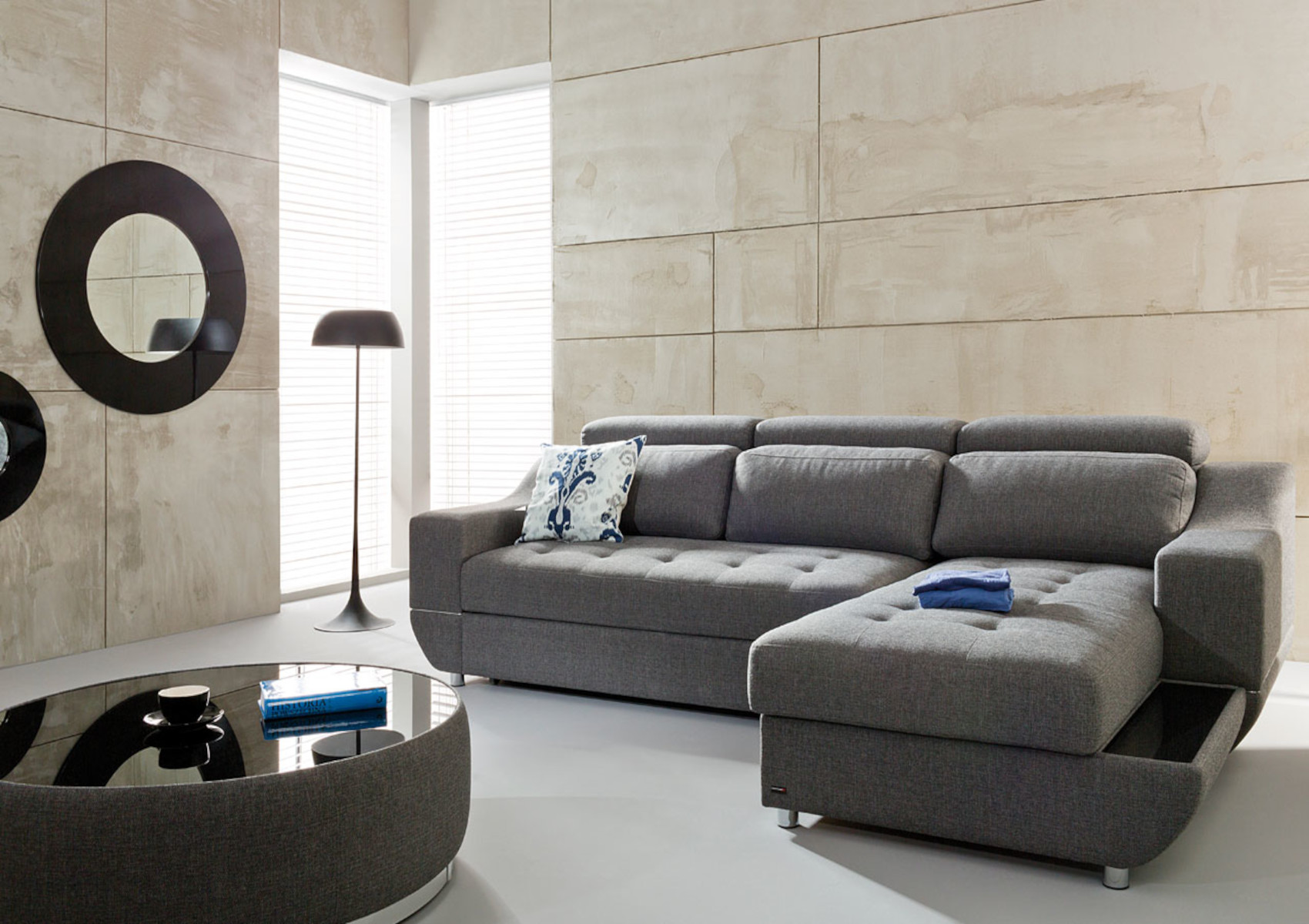 Součástí pohovky je rozkládací systémem ke každodennímu spánku a úložný prostor k uložení přikrývek. Na boční straně je police k položení knih, časopisů nebo skleniček s vodou. Nábytek stojí na nízkých chromových nožkách ve stříbrném odstínu.