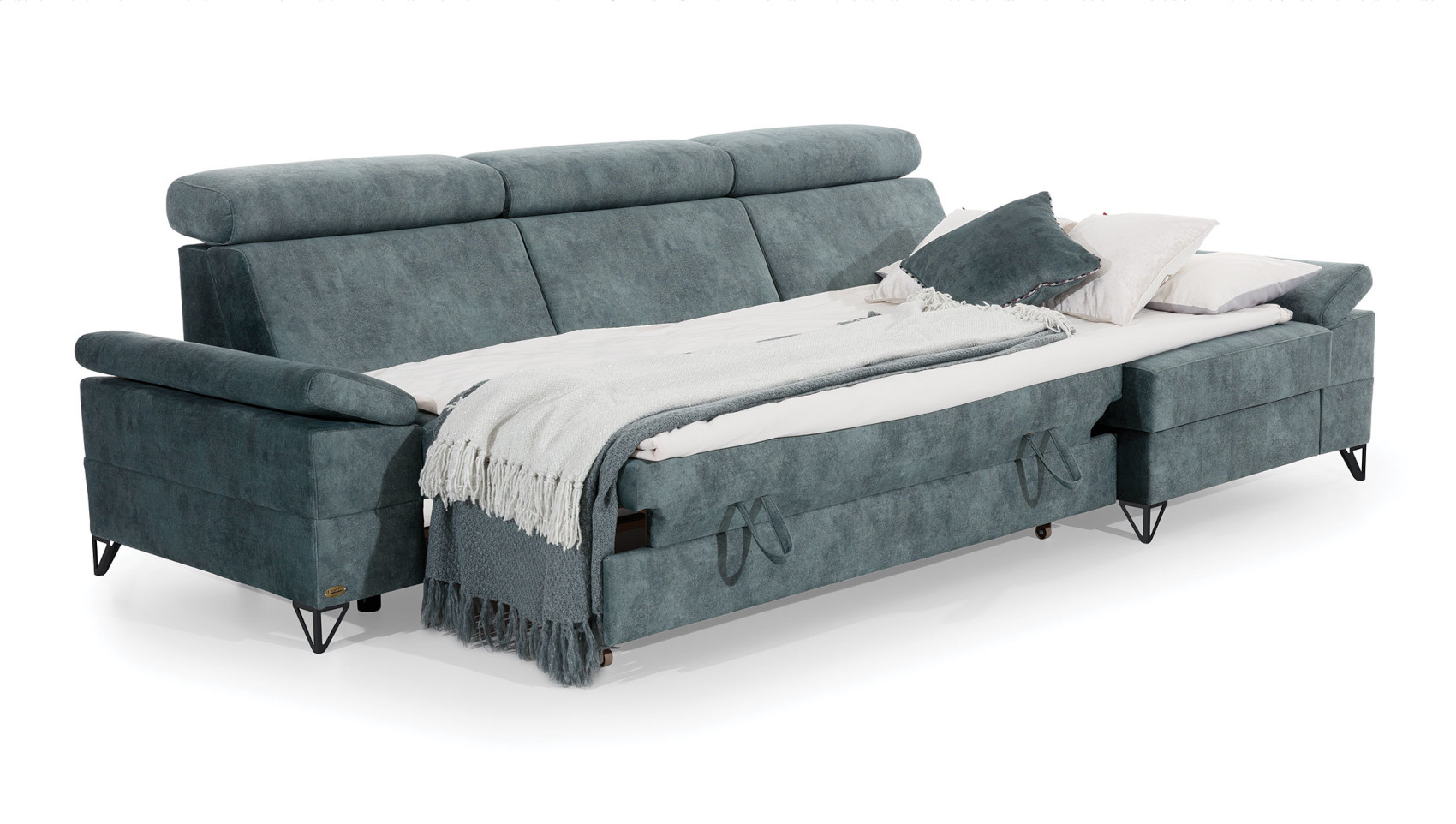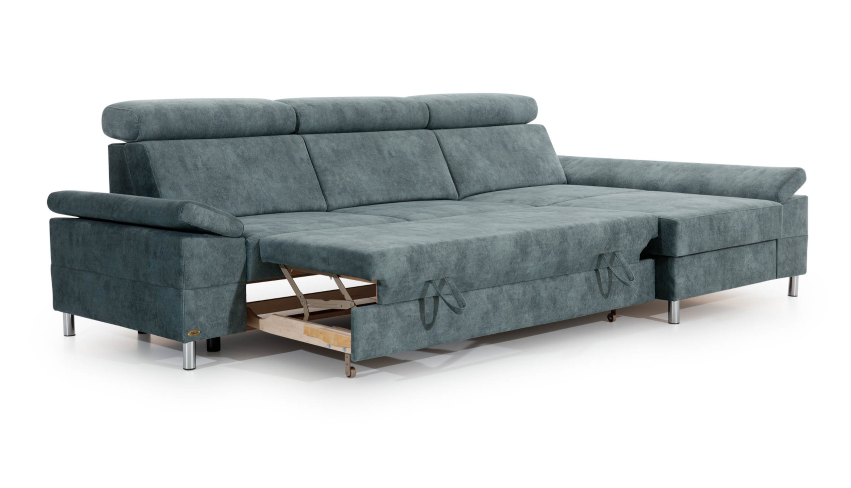 Rohová sedací souprava Lazaro s rozkladem a ÚP z bukového dřeva