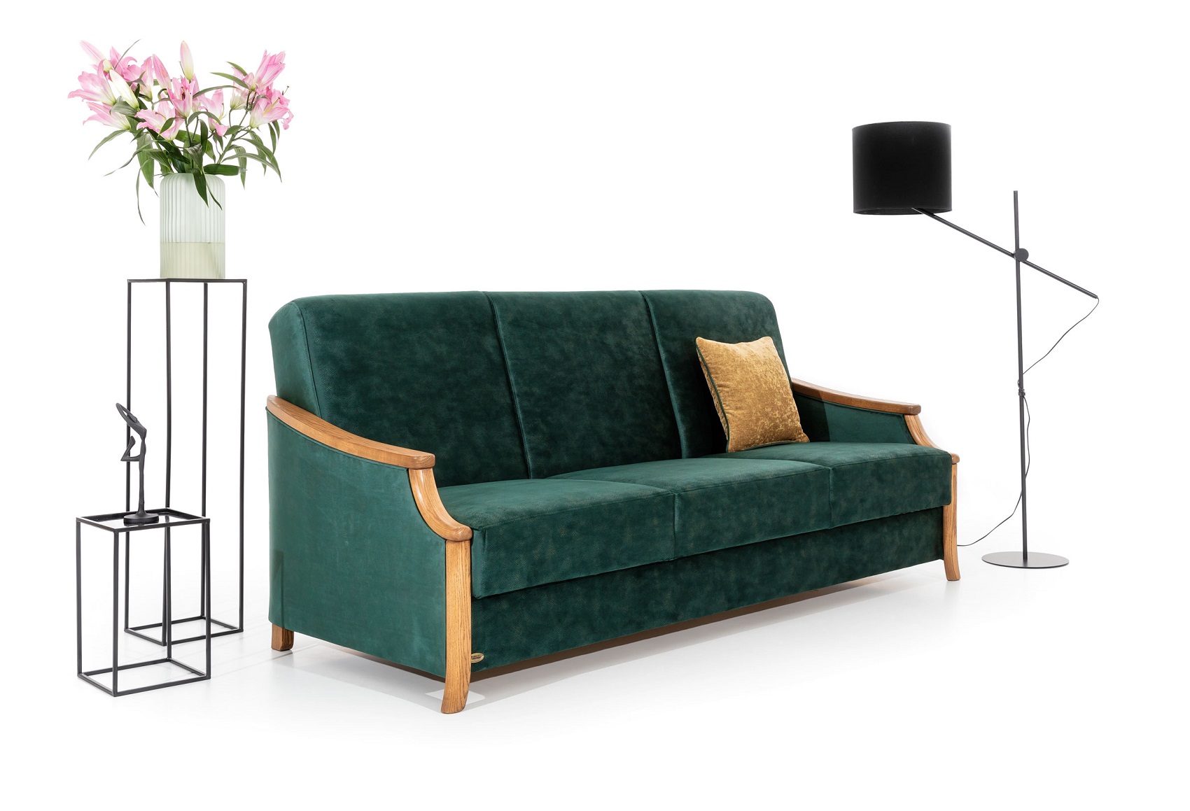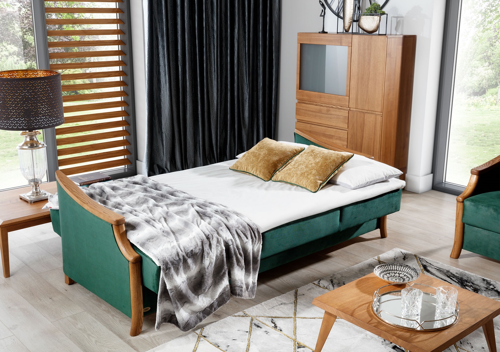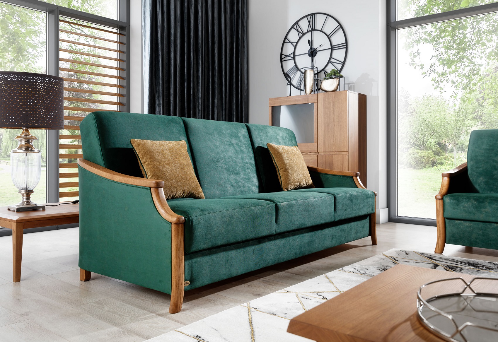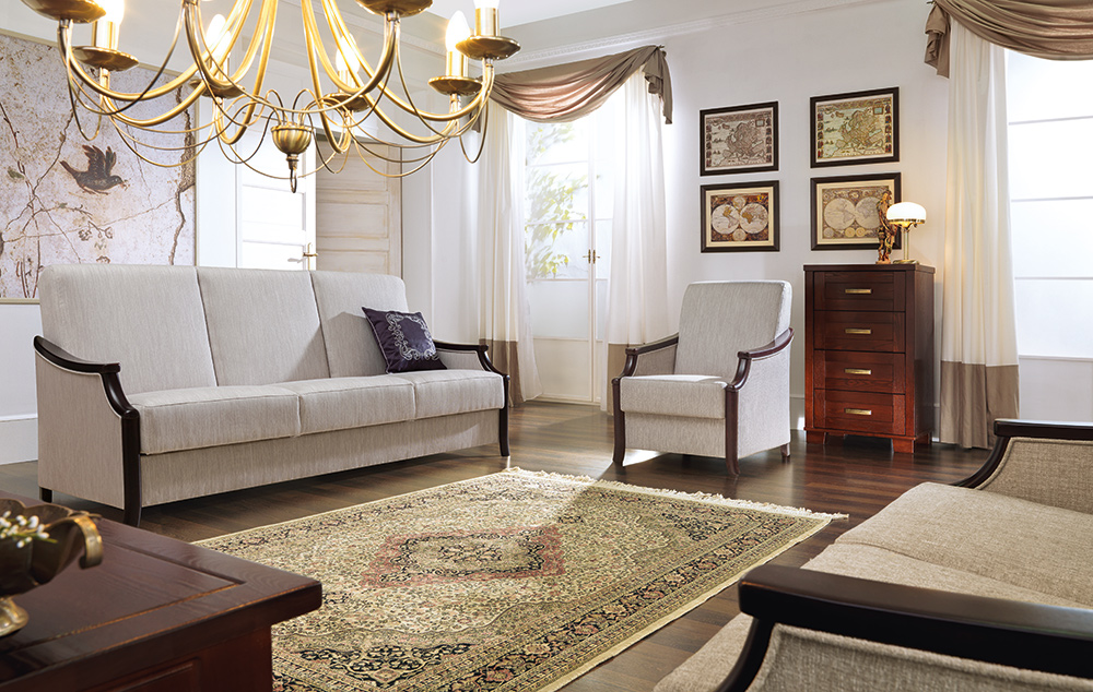 Sedací souprava Elegant IV je vyrobena v klasickém stylu s prvky elegance. Součástí sestavy je křeslo a pohovka s rozkládacím systémem určeným ke spánku a úložným prostorem. Skelet nábytku je z masivního bukového dřeva, které vám vzhledem ke své tvrdosti zaručí kvalitu a stabilitu.