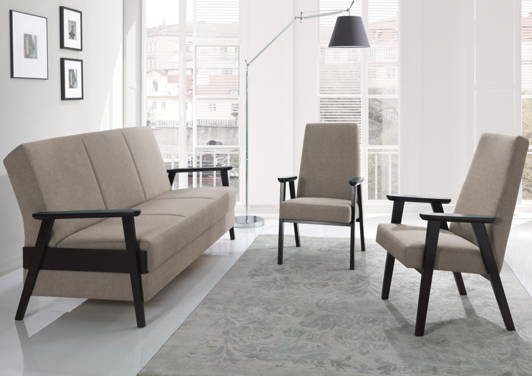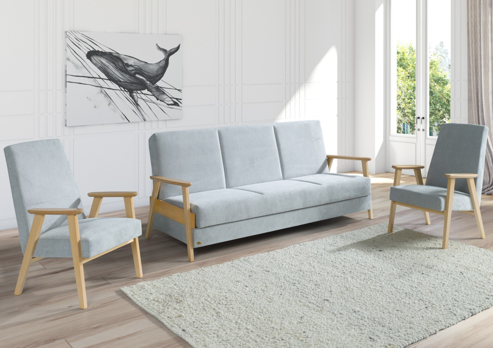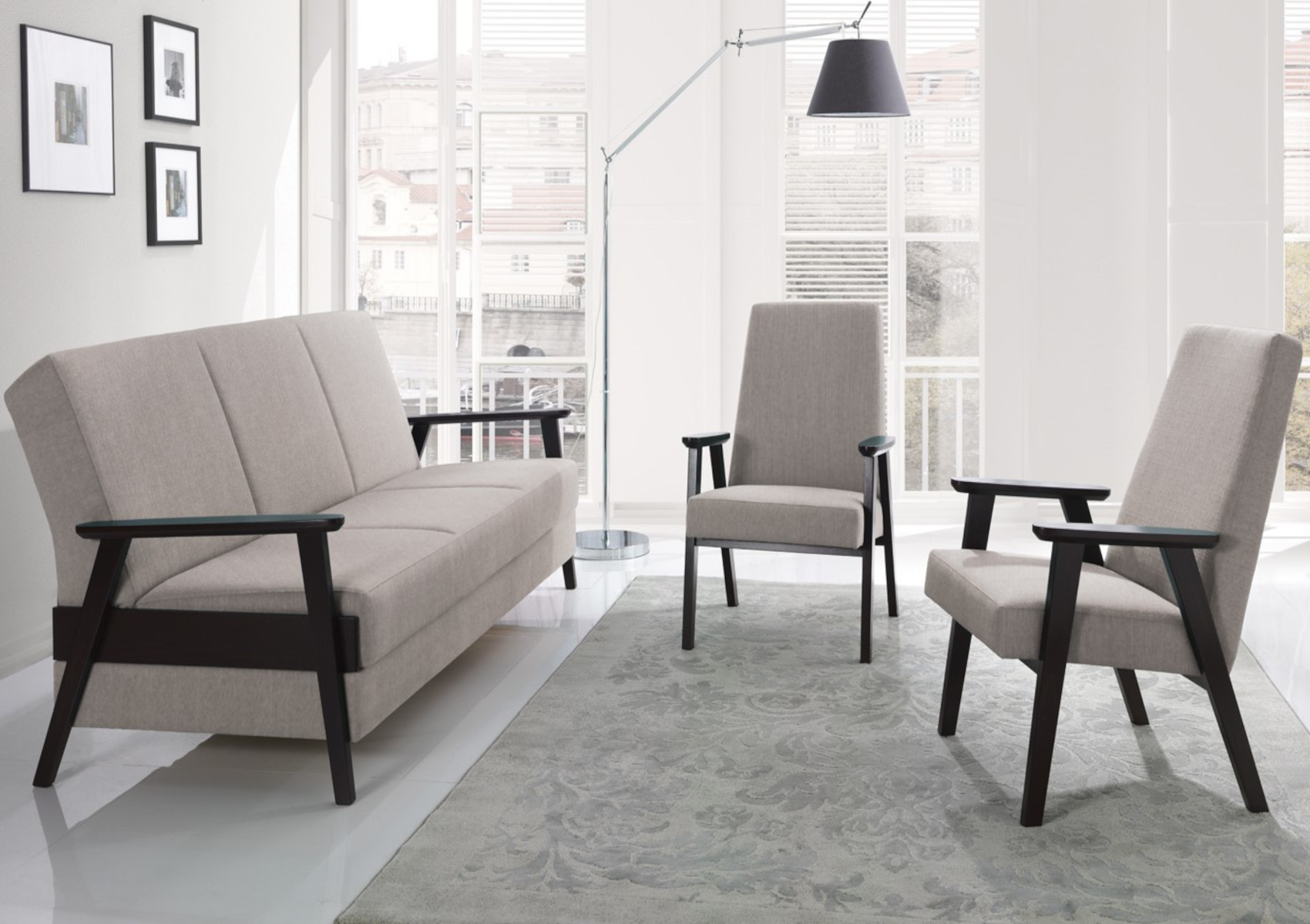 Klasická sedací souprava Retro vás zaujme svým jednoduchým designem s prvky elegance. Součástí sestavy jsou 2 křesla a pohovka s rozkládacím systémem a prostorem k uložení ložního prádla nebo přikrývky. Nábytek je vyroben z masivního bukového dřeva, které svou tvrdostí vám zajistí jeho stabilitu.
