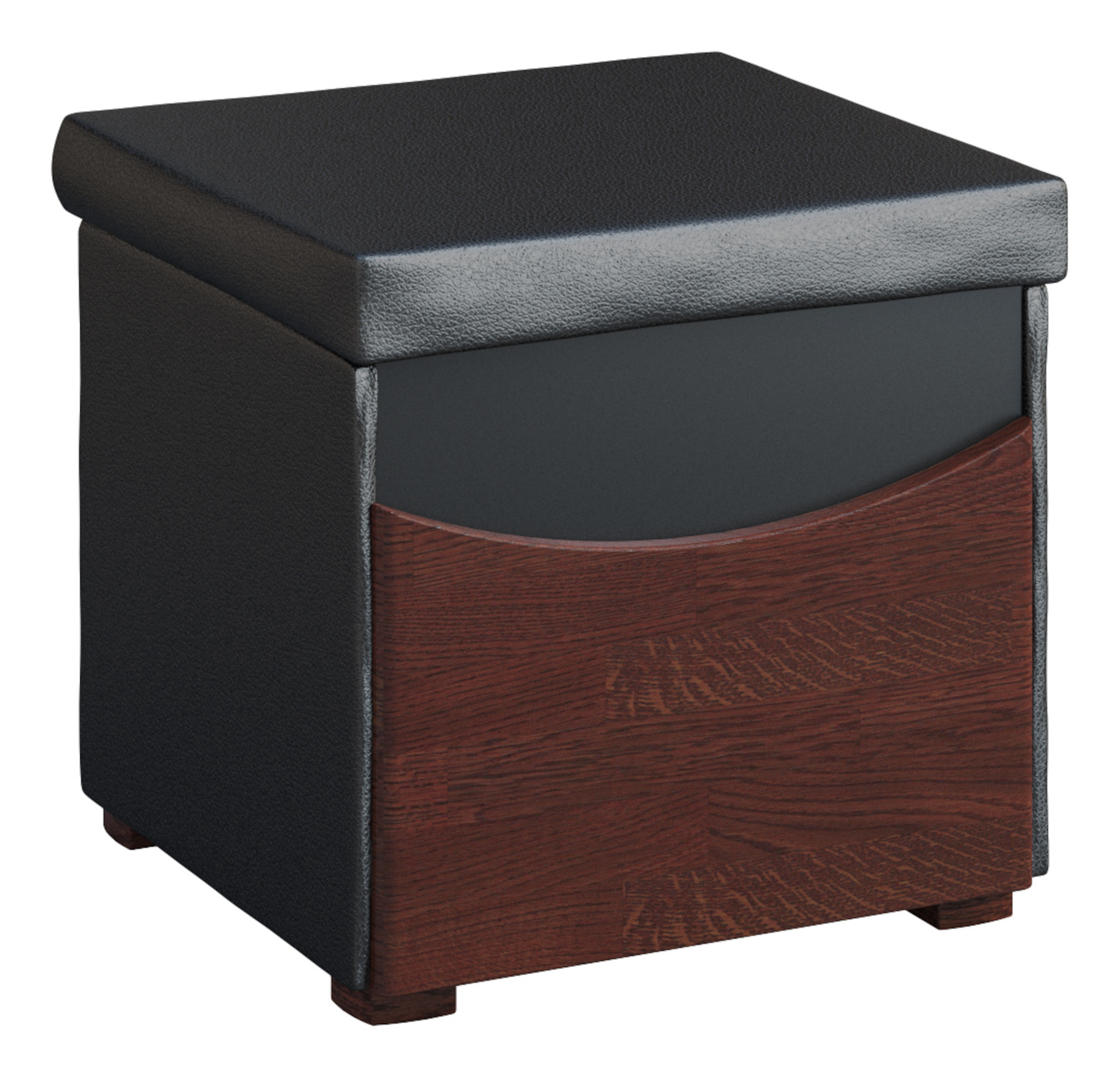 Taburet Riva s úložným prostorem je vyroben z přírodní dubové dýhy a očalouněný černou ekologickou kůží. Čtyřvrstvá technologie povrchového moření a lakování dává nábytku jedinečný design s výraznou strukturou lét masivního přírodního dřeva.
