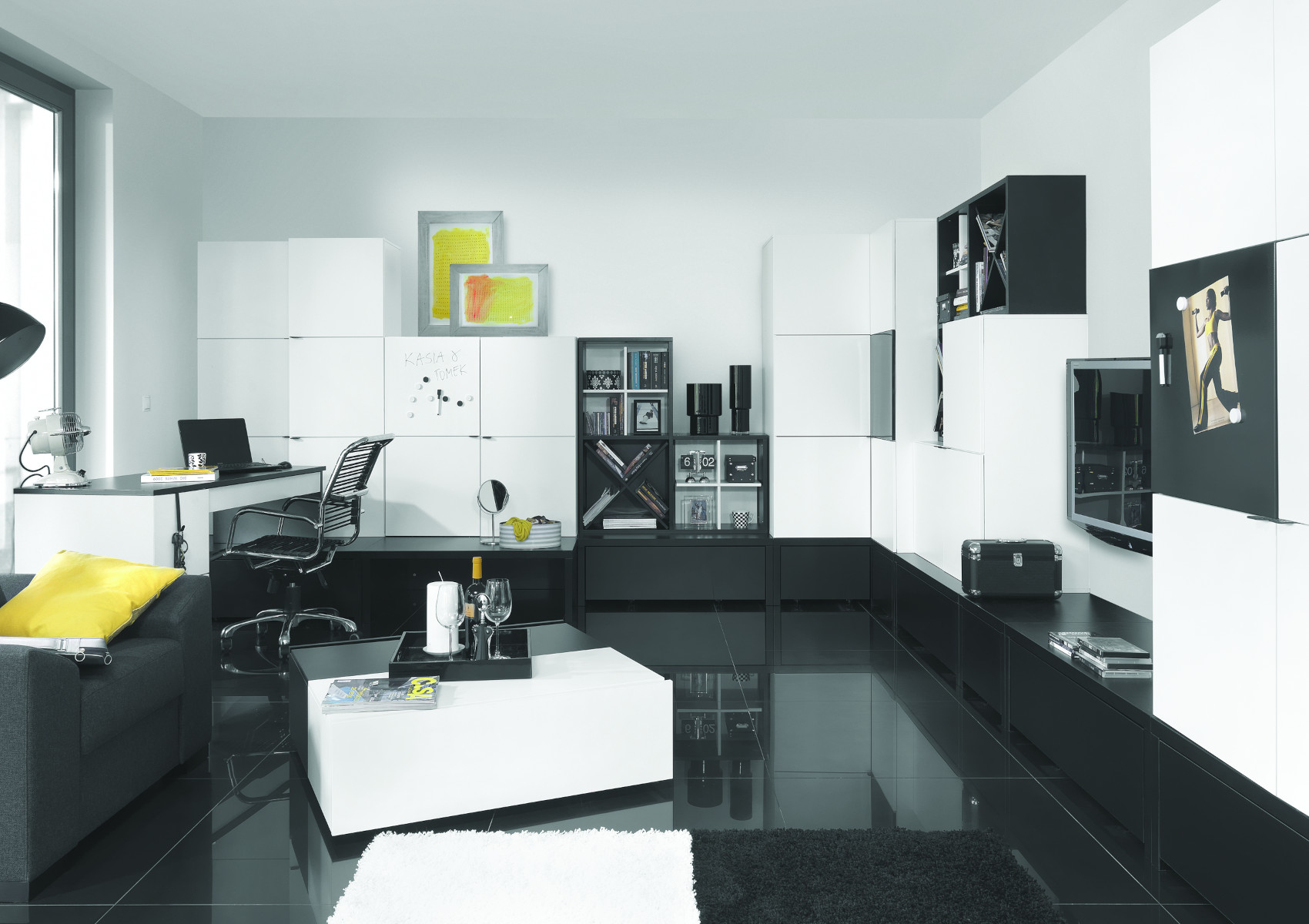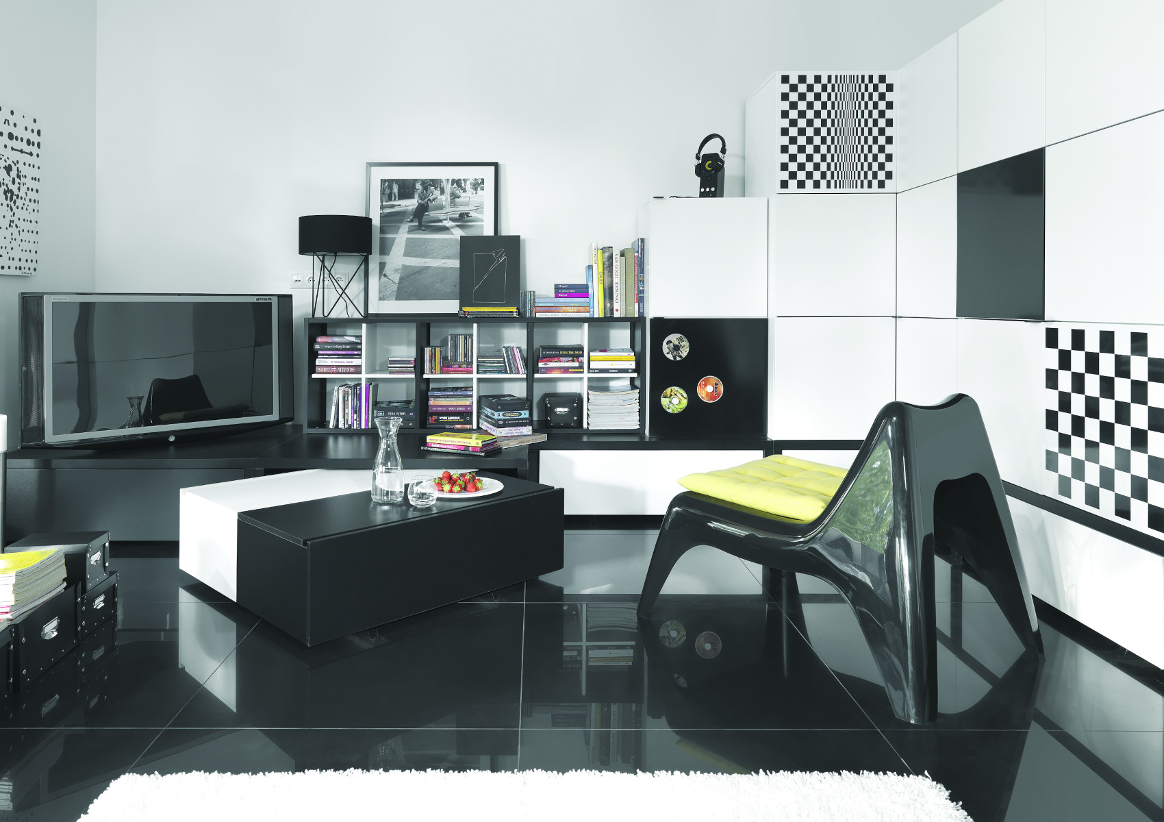 Obývací pokoj Young Users vás zaujme svým prostým designem s moderními prvky. Nábytek je vyroben z kvalitního lamina o síle 38 mm a 16 mm odolného vůči poškrábání a nečistotám. Horní části jsou v bílém odstínu, ale korpusy podesty si můžete vybrat ze 2 barev - černý mat nebo bílá. Zásuvky i dvířka mají zabudovaný systém tichého dovírání. Na spodní straně podesty jsou gumová kolečka, díky kterým můžete s nábytkem snadno a libovolně pohybovat po místnosti.