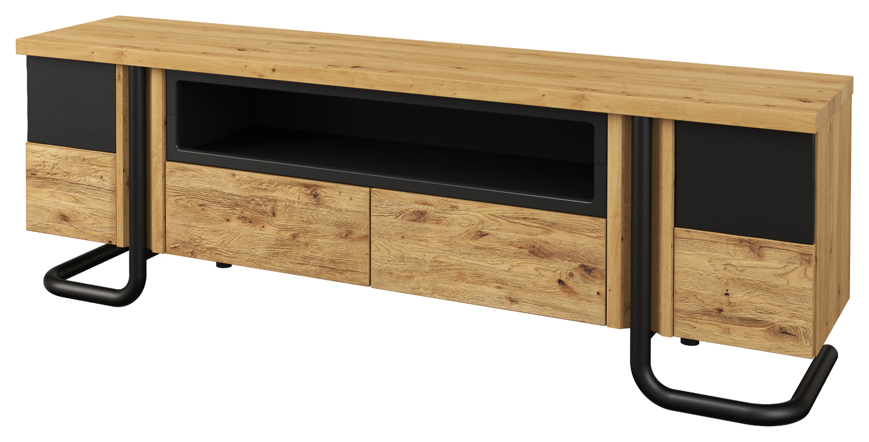RTV stolek Omega maxi vás zaujme svým luxusním designem. Přední část je vyrobena z masivního dubového dřeva a korpus z přírodní dubové dýhy. Jedinečnými prvky jsou černé kožené detaily na dvířkách a ohnuté ocelové tyče, které jsou díky práškovému lakování odolné vůči poškození. Kvalitní lakování a moření dodává nábytku přirozený vzhled dřeva a zdůrazňuje strukturu lét. Dvířka a zásuvky mají jednoduchý dotykový systém otevírání - Push to open.