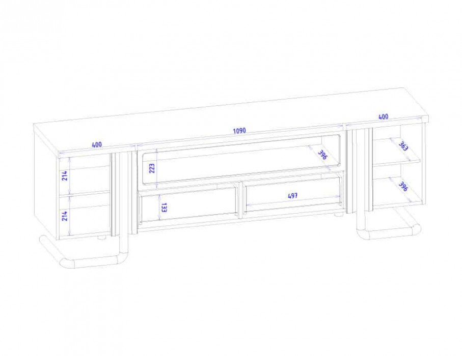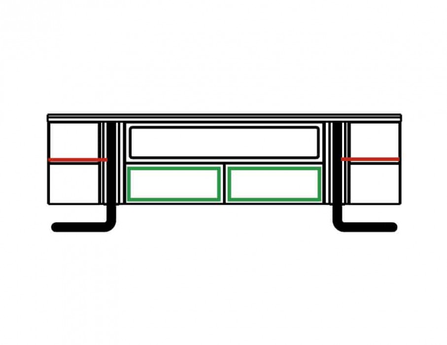 Stolek má po stranách 2 malá dvířka se 2 lakovanými policemi. Ve spodní části jsou 2 zásuvky na kovových pojezdech a nad nimi otevřená nika k uložení elektroniky.