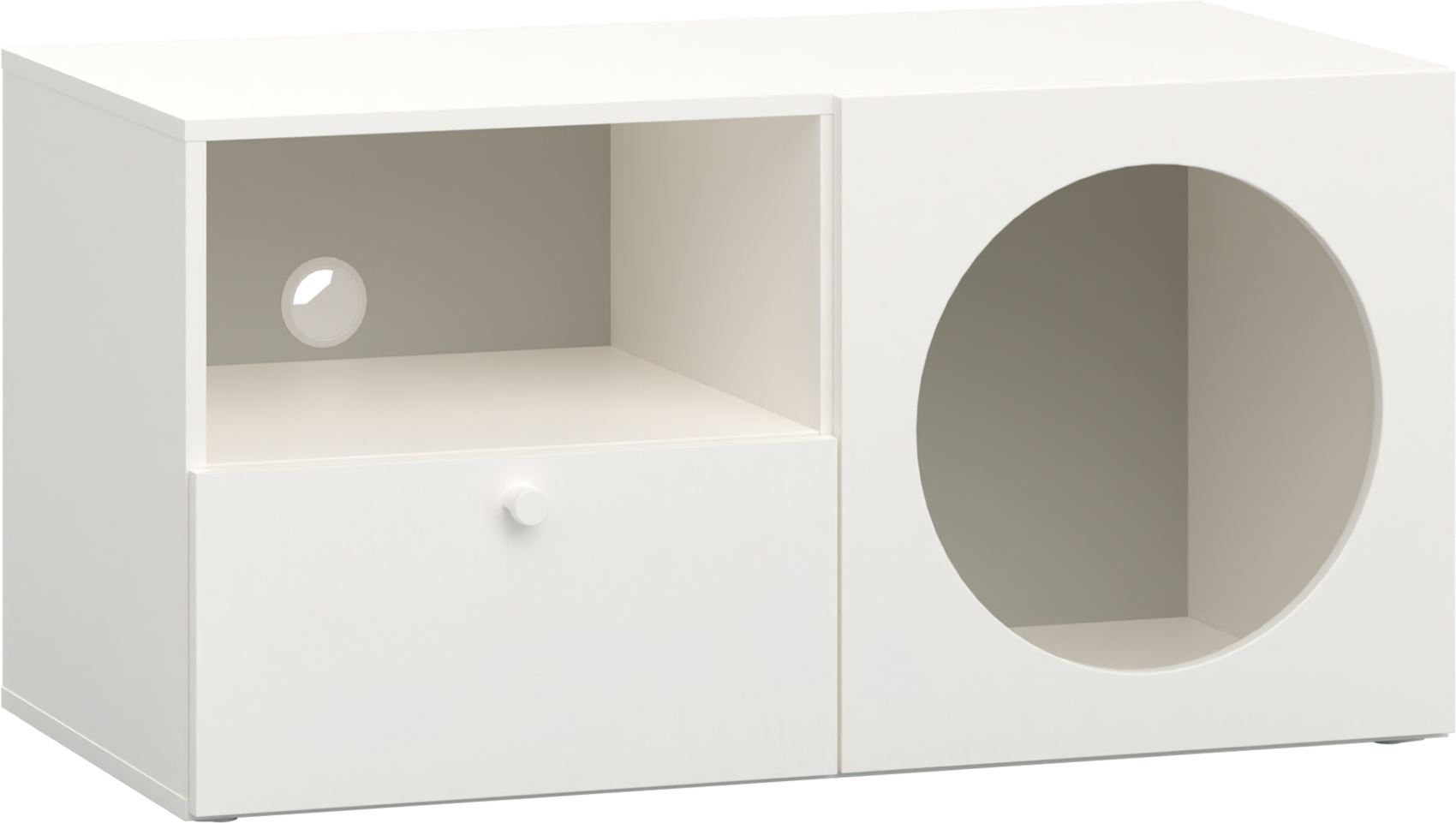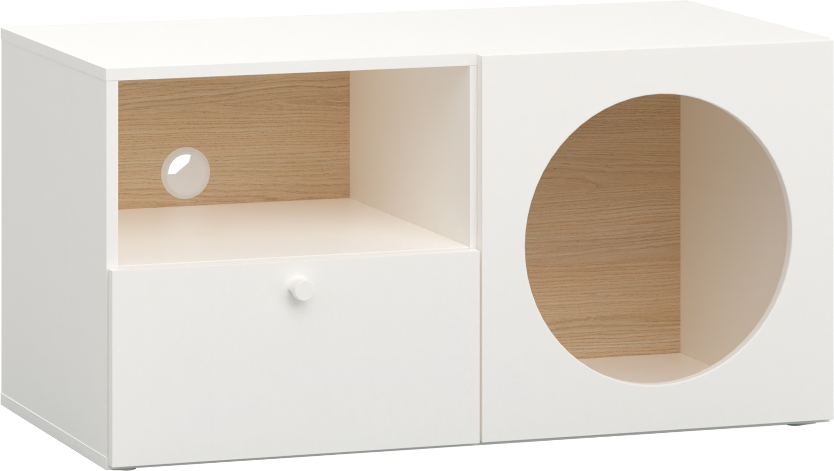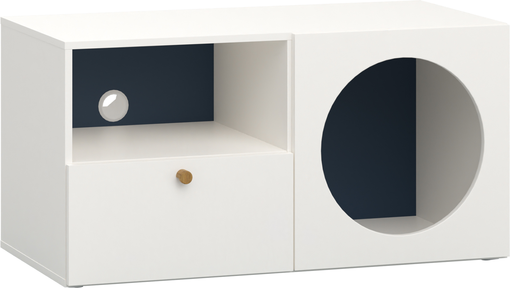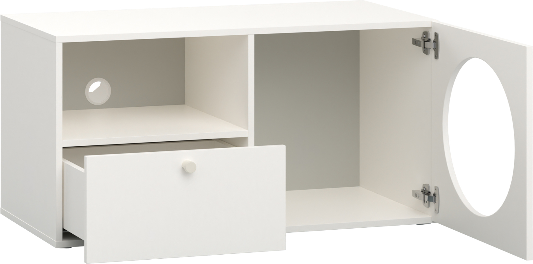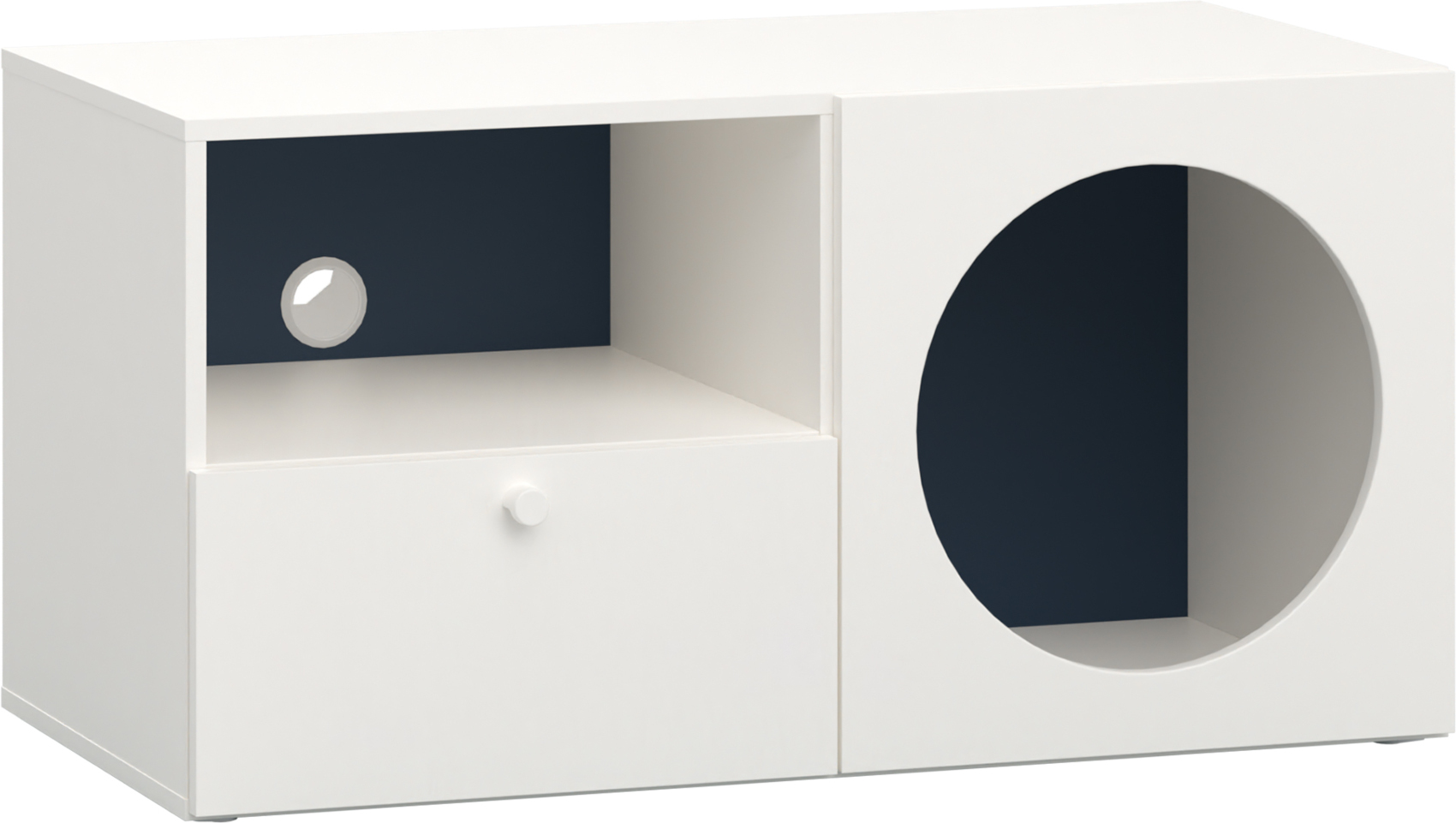 Součástí skříňky je 1 prostorná zásuvka na kovových pojezdech se zabudovaným systémem tichého dovírání. Nad zásuvkami je otevřená nika s připraveným vývodem pro kabeláž. Do niky si můžete uložit elektroniku. Na pravé straně jsou dvířka s otvorem, kde se budou vyjímat vaše oblíbené dekorace.