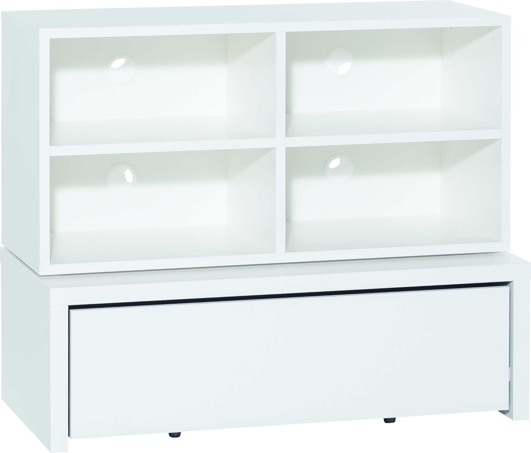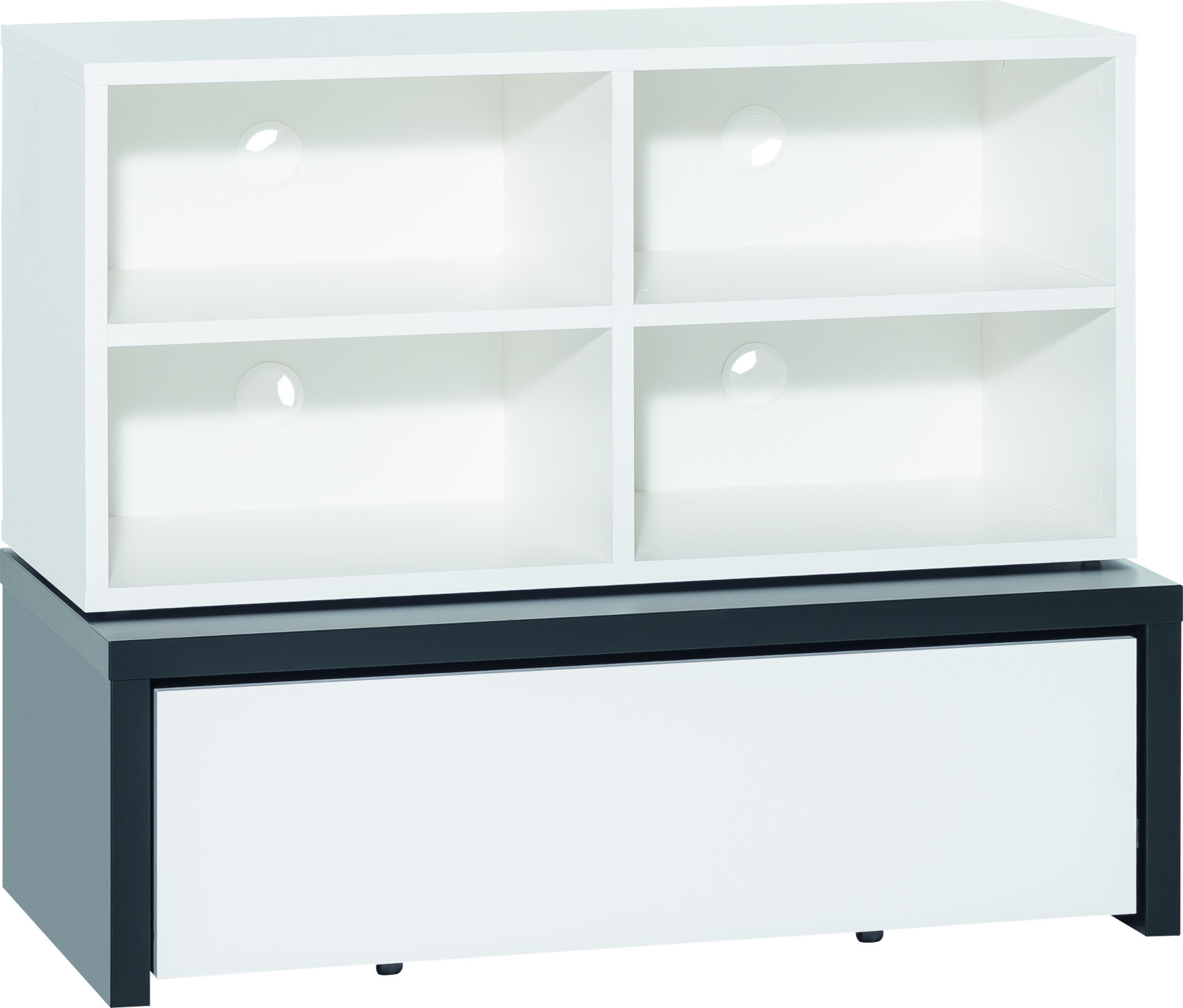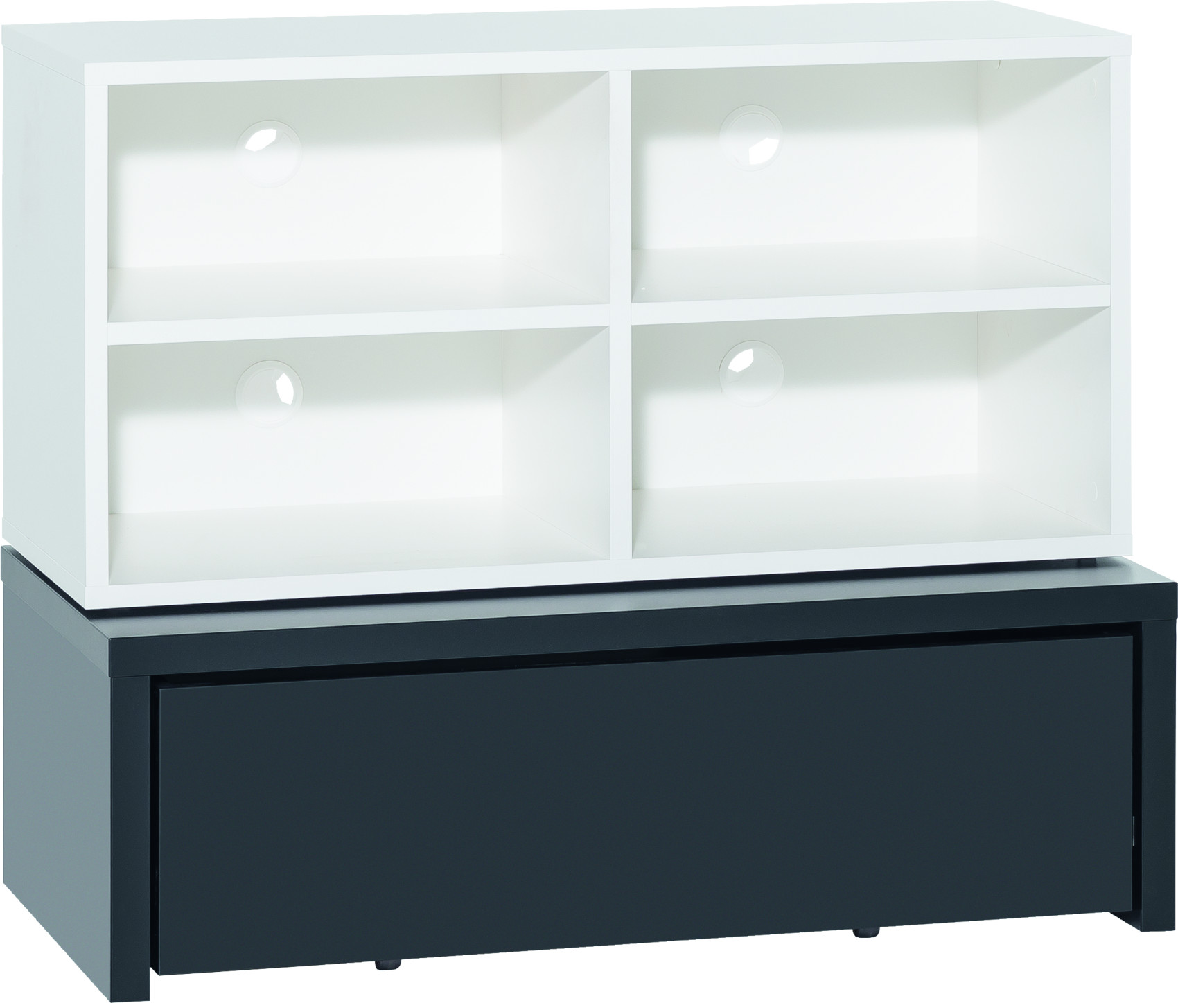 Skříňka má 4 otevřené niky k vystavení elektroniky, knih, dekorací nebo kazet. V zadních stěnách mají niky připravené vývody pro kabeláž. Součástí podesty je zásuvka k uložení vašich nezbytností. Zásuvka je oboustranná, tudíž si lze zvolit barevnou variantu přední strany - černá nebo bílá.
