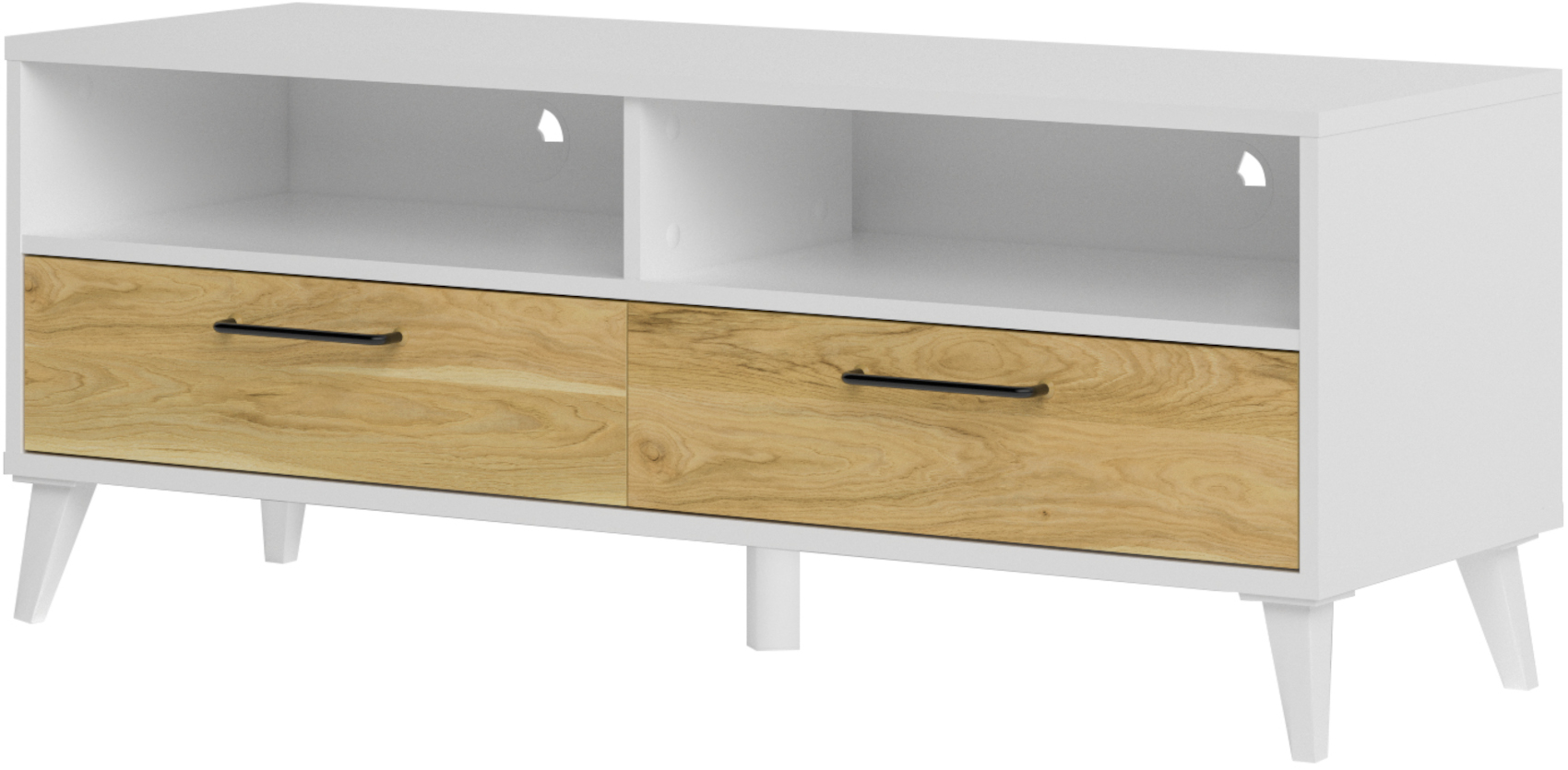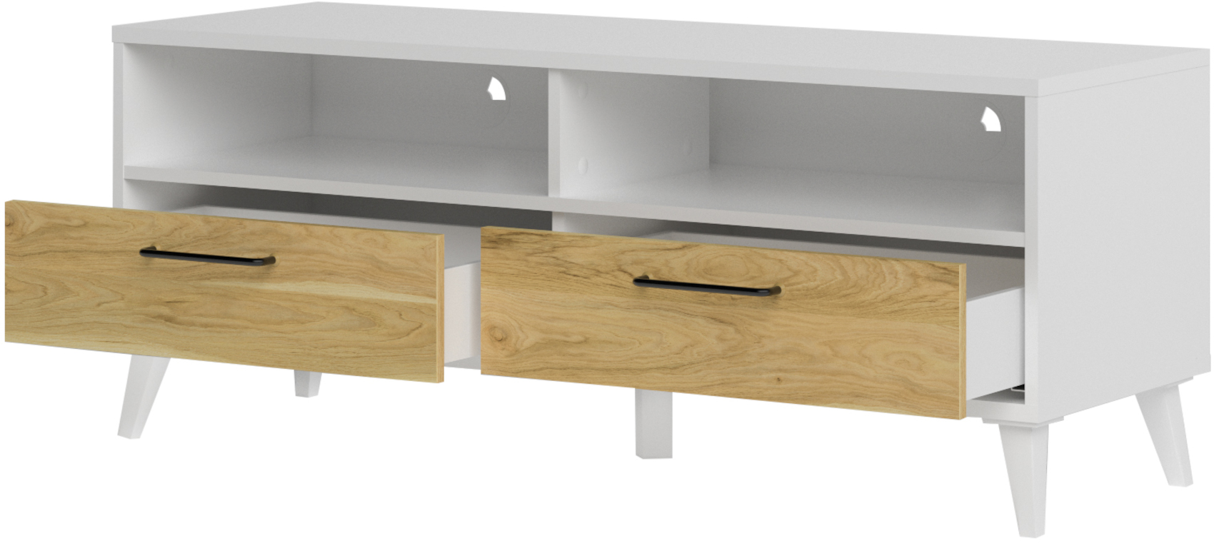 Televizní stolek má 2 zásuvky na kovových pojezdech, nad kterými jsou 2 otevřené niky k uložení elektroniky. V zadní části nik jsou připravené 2 vývod pro kabeláž.