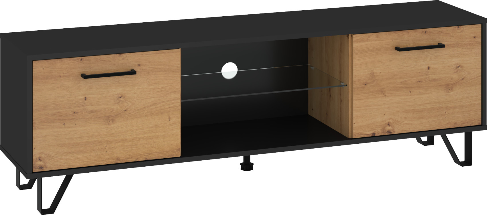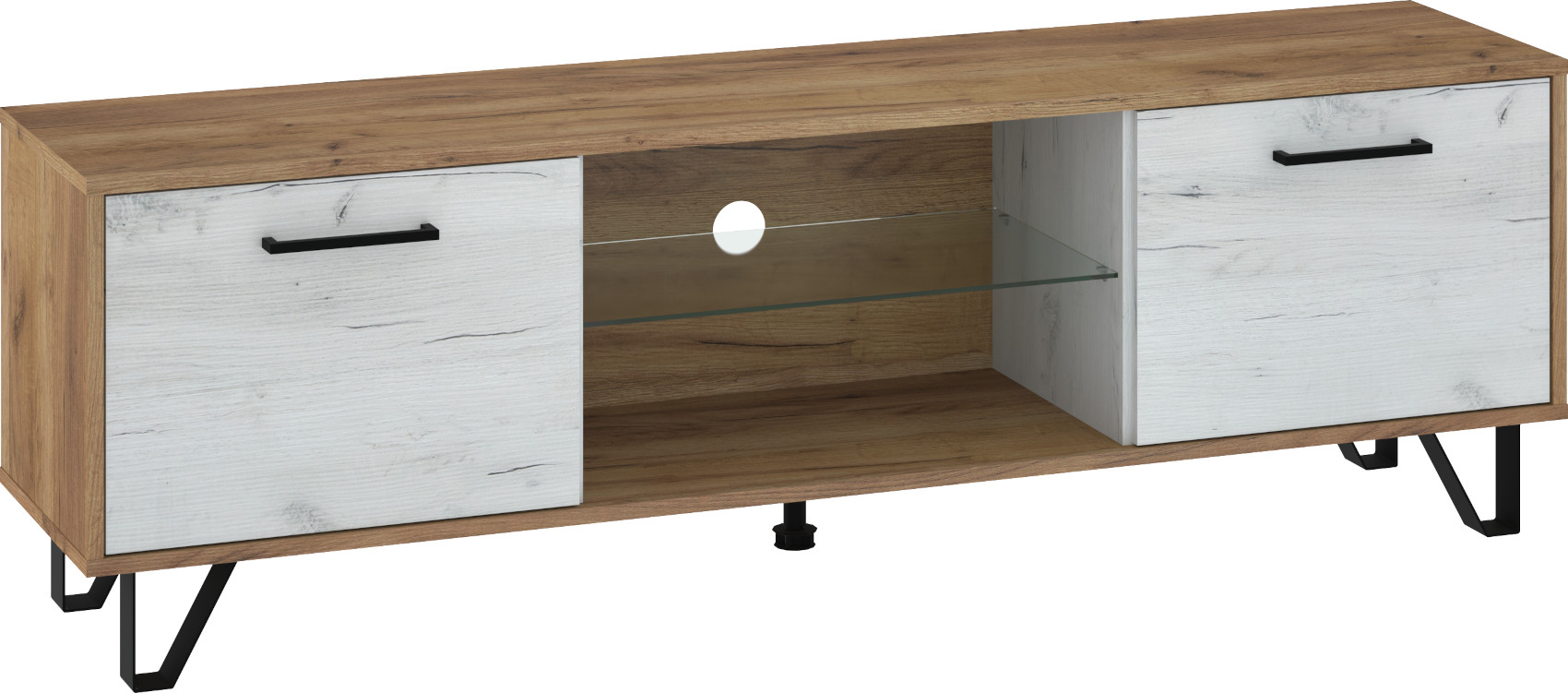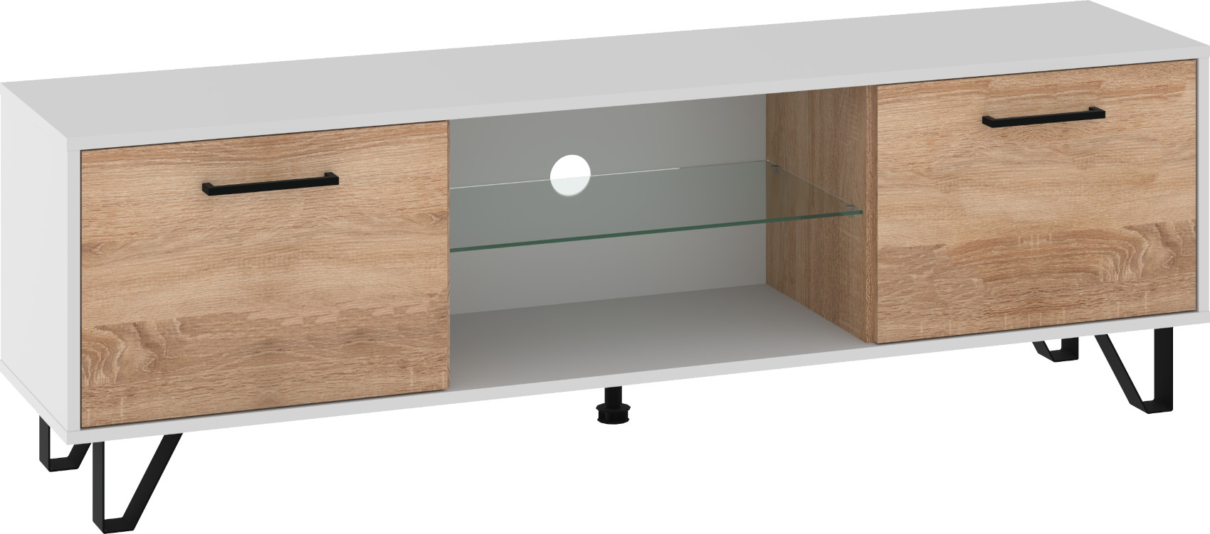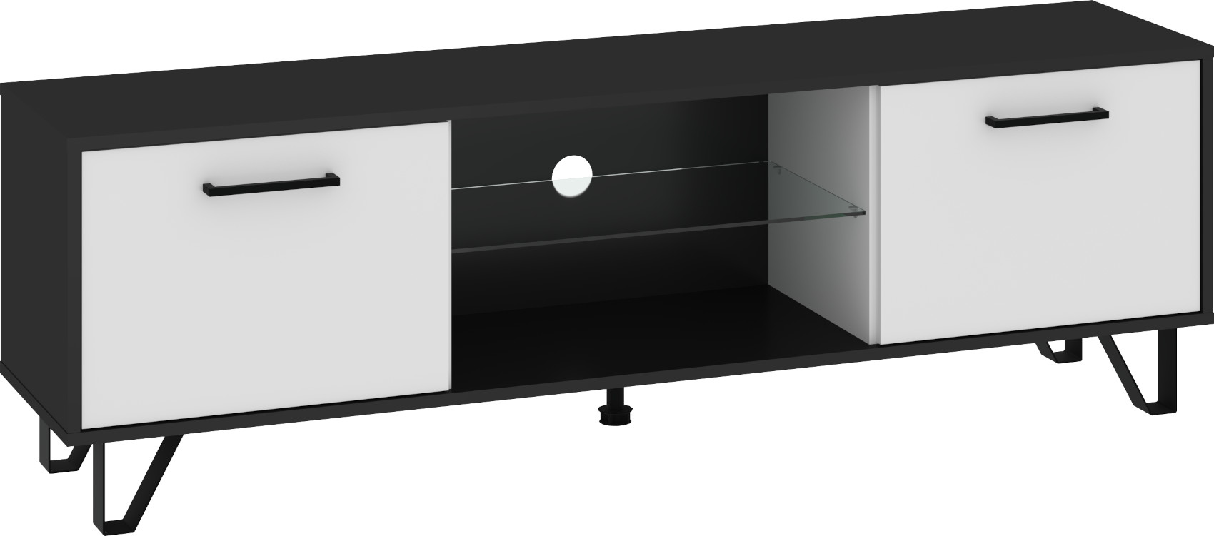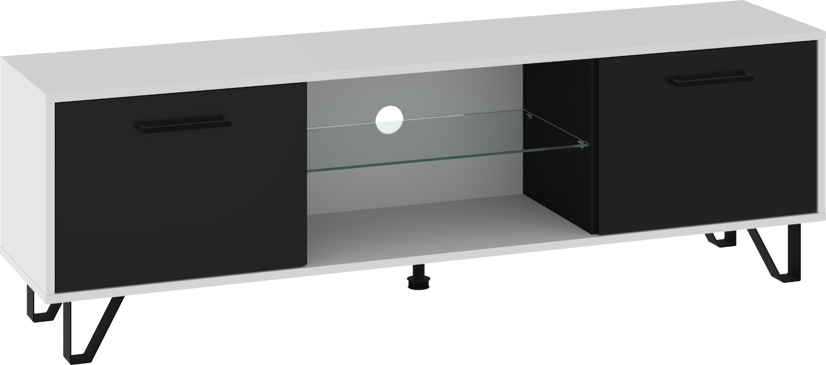 Součástí stolku jsou 2 dvířka, mezi kterými je otevřená nika se skleněnou policí a připraveným vývodem pro kabeláž.