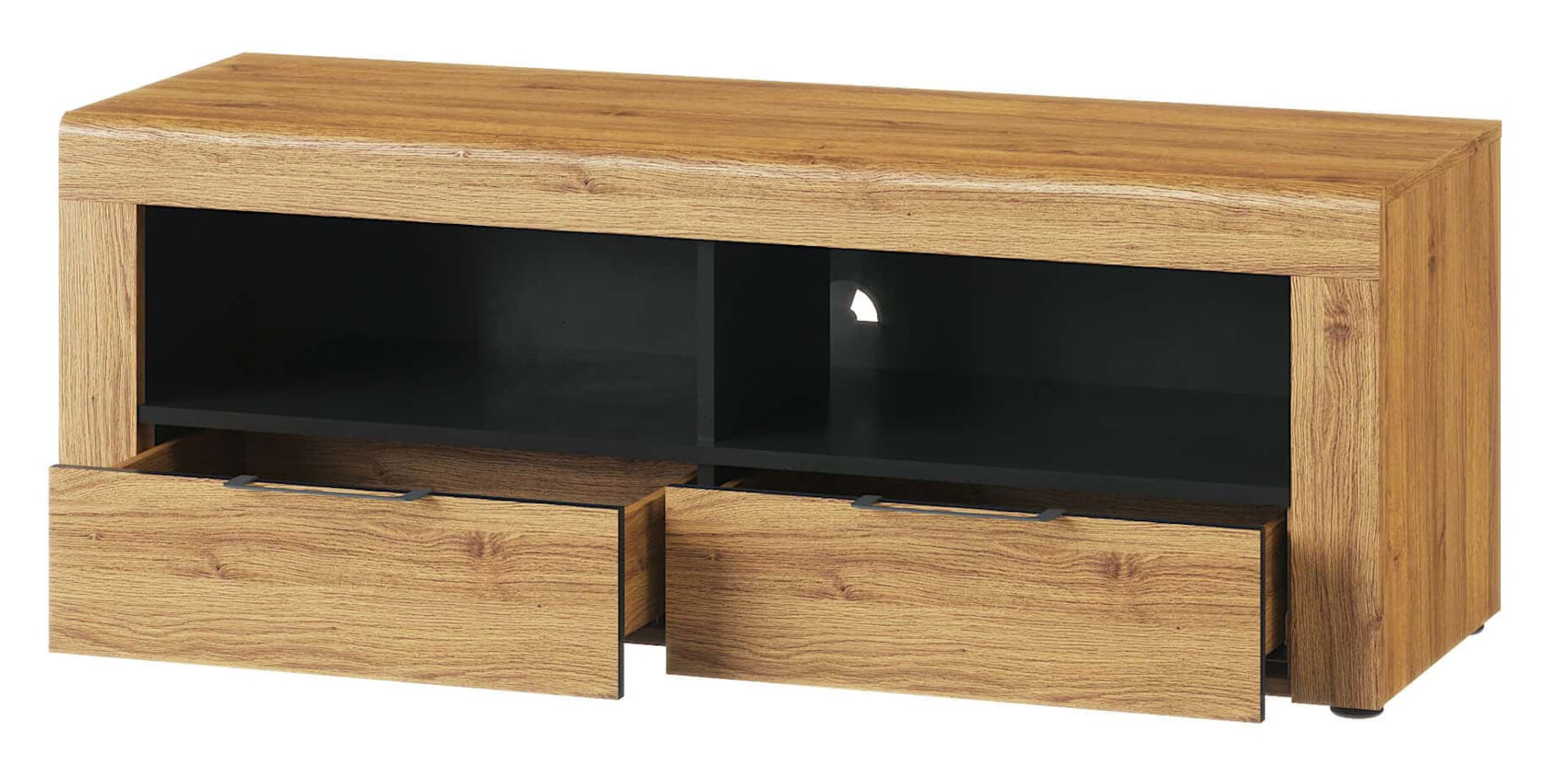 Moderní RTV stolek Kama 24 vás zaujme svým prostým designem s viditelnou strukturou dřevěných lét. Je vyroben z lamina potaženého fólii, která navodí dojem přírodního dřeva. Jedinečným prvkem jsou matně černé lakované detaily s úchyty. Zásuvky mají systém tichého dovírání.