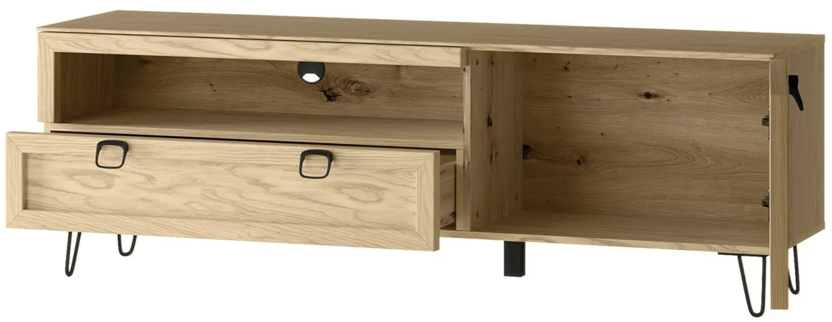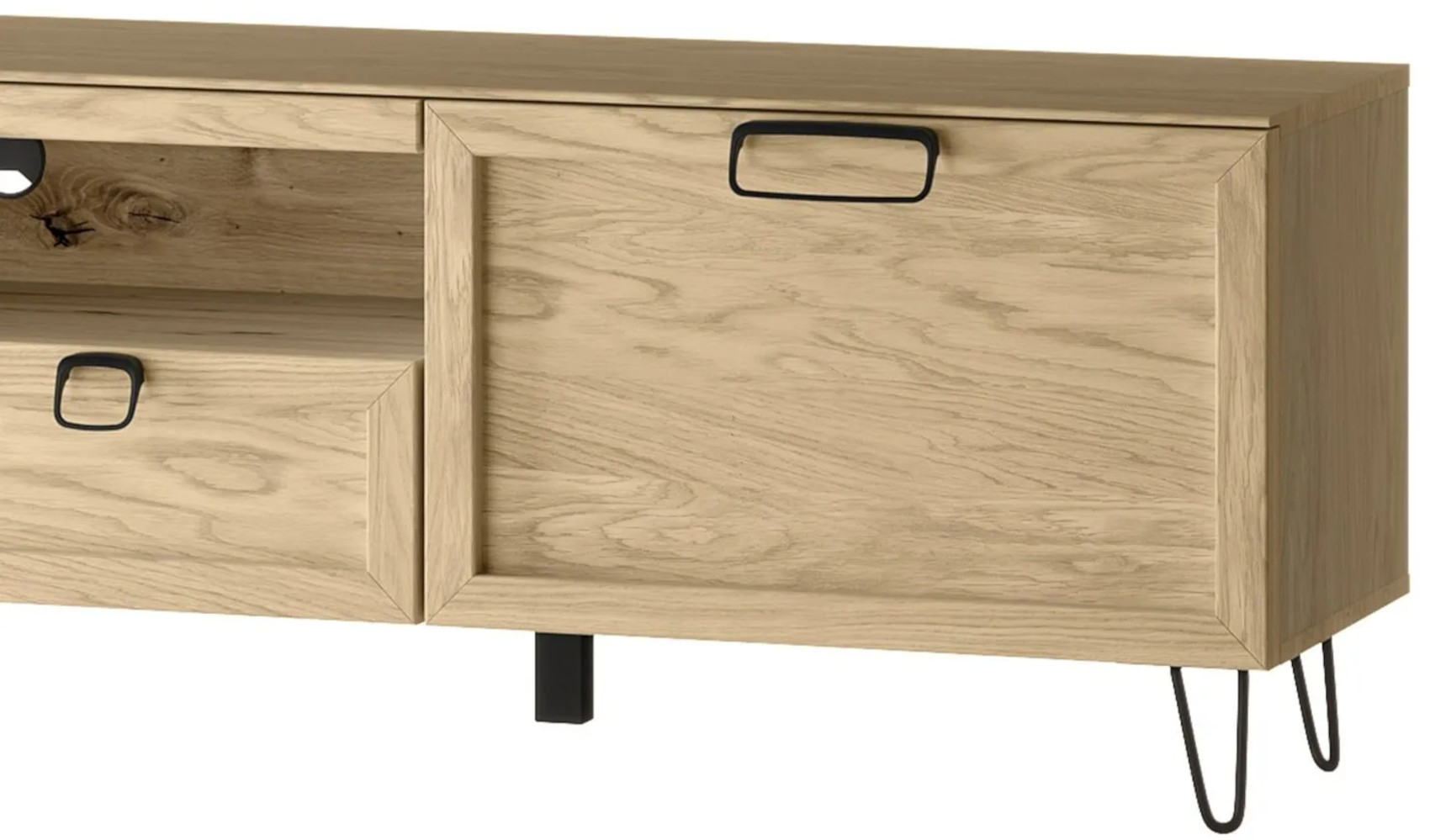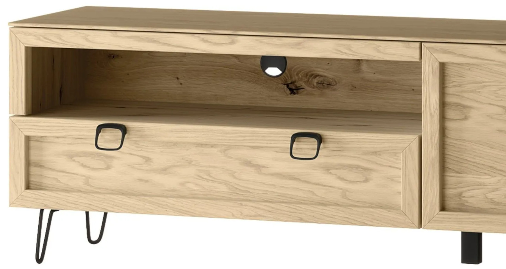 Televizní stolek Limbo 25 vás zaujme svým přírodním designem s viditelnou strukturou dřevěných lét. Přední dvířka a zásuvka, se systémem tichého dovírání, jsou vyrobeny z masivního dubového dřeva a korpus z přírodní dubové dýhy, která je potažena fólií. Součástí stolku jsou kovové úchyty a nožky v odstínu černý mat, které dodají nábytku nádech elegance a provzdušní váš celkový prostor.