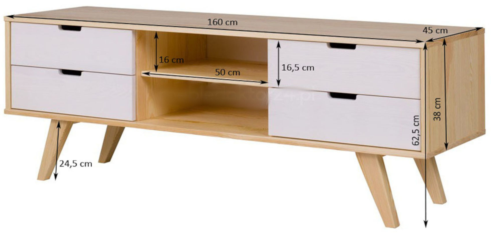 Stolek má 4 krajní zásuvky na kovových pojezdech se zabudovaným systémem tichého dovírání. Mezi zásuvkami jsou 2 otevřené niky k uložení elektroniky.