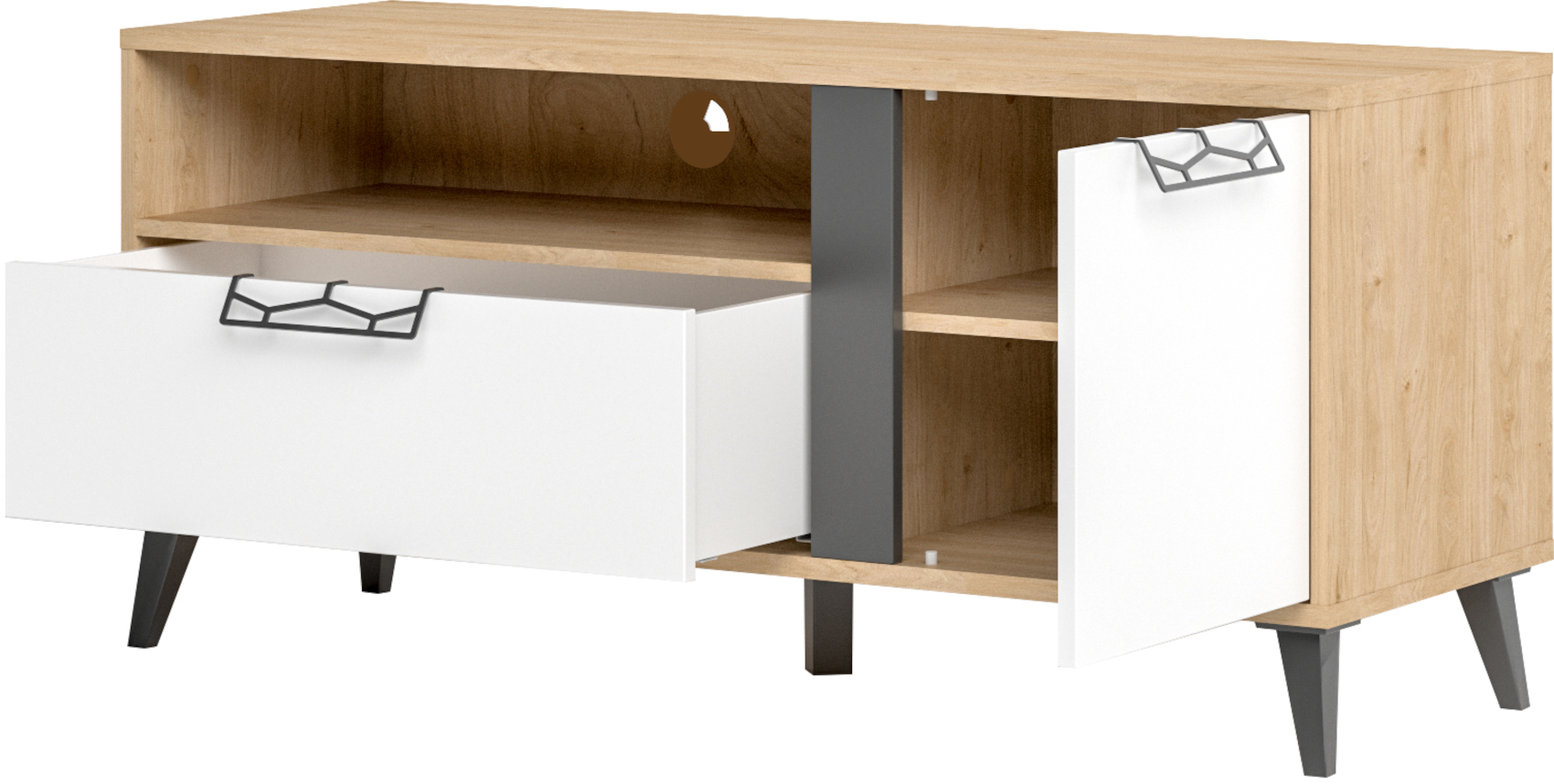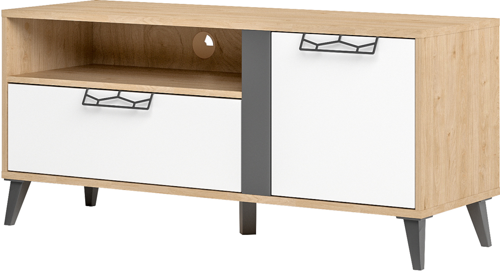 Moderní RTV stolek Moet 24 vás zaujme svým prostým, ale zároveň luxusním designem. Je vyroben z kvalitního odolného lamina potaženého speciální fólií, která vám navodí dojem přírodního masivního dřeva. Úzké nožky dodají nábytku nádech retro stylu a provzdušní váš celkový prostor. Jedinečným prvkem jsou speciálně tvarované úchyty vyrobené z oceli v šedém odstínu. Dvířka i zásuvky mají zabudovaný systém tichého dovírání.