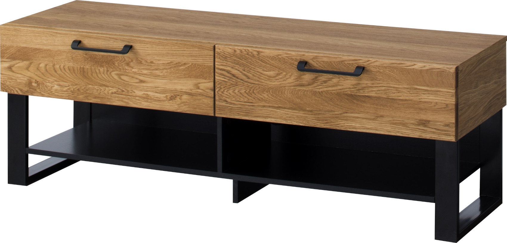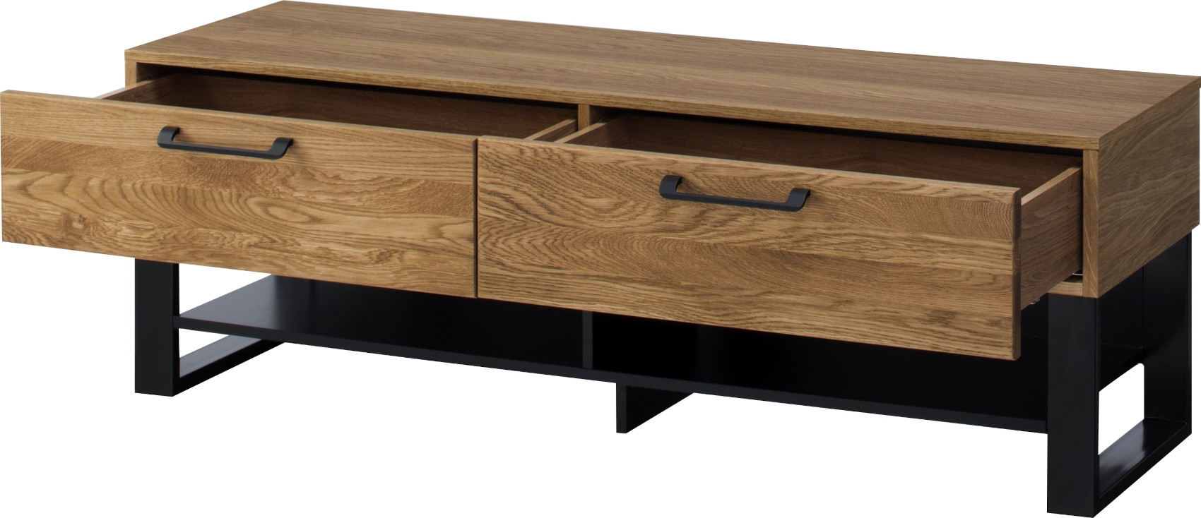 Součástí stolku jsou 2 horní zásuvky na kovových pojezdech a pod nimi jsou 2 otevřené niky k uložení elektroniky.