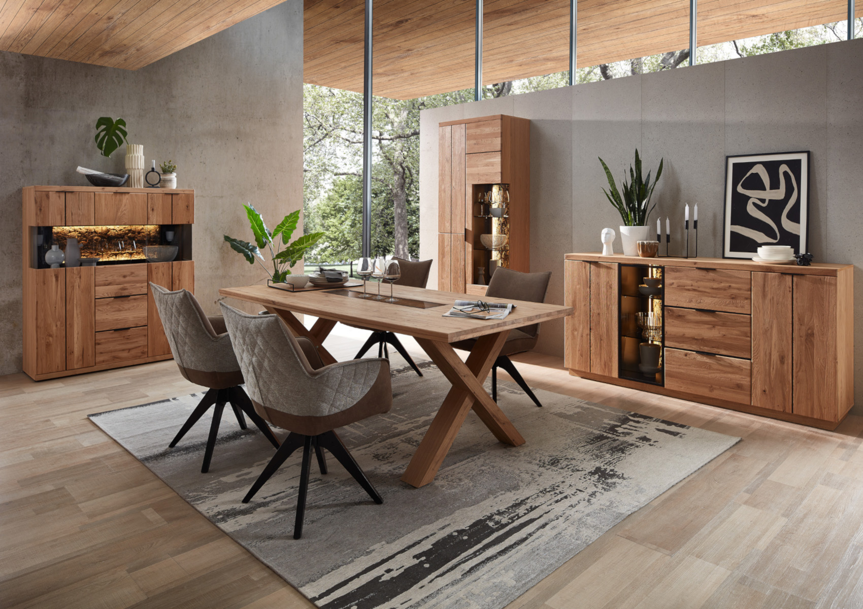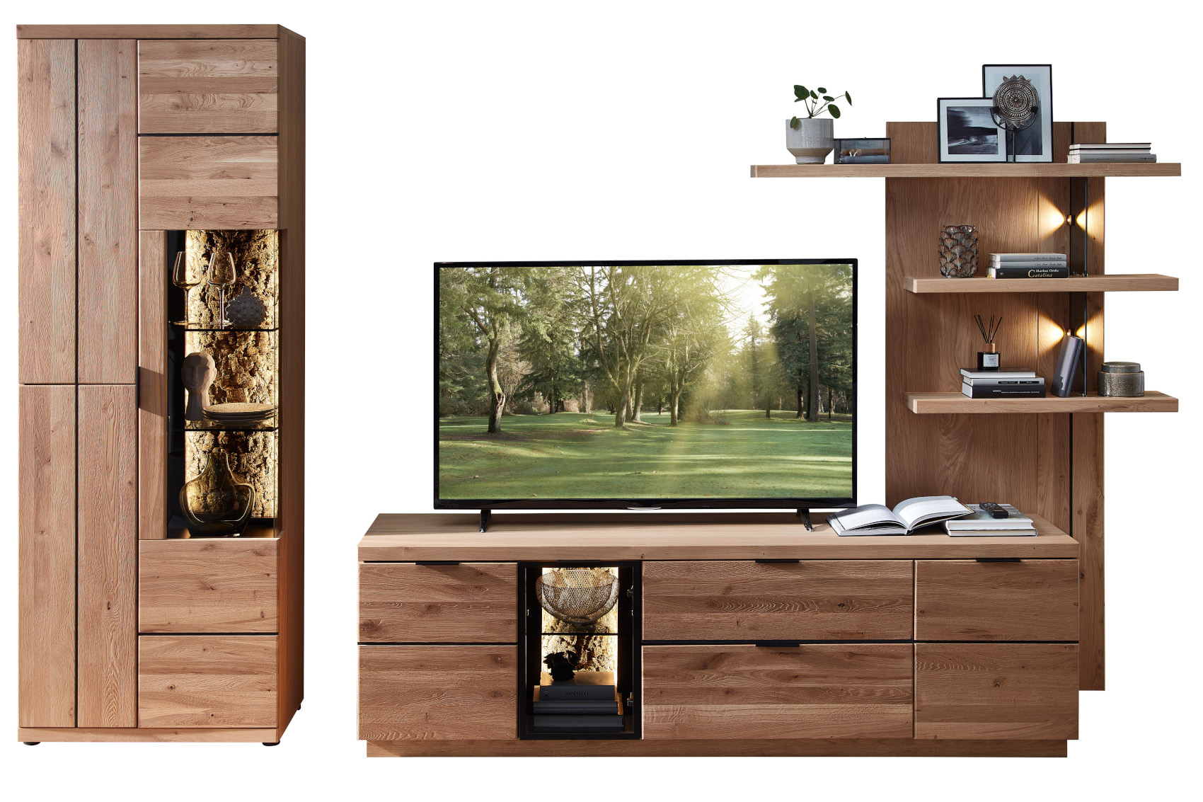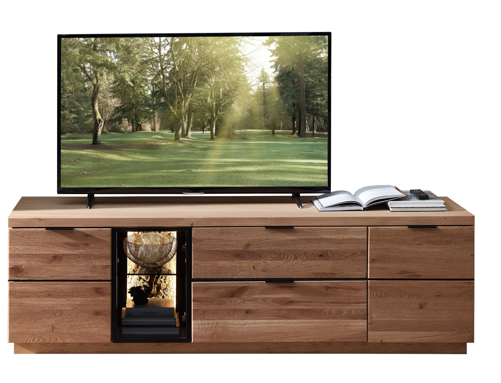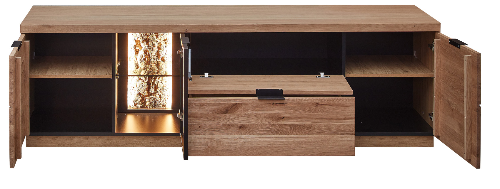 Moderní RTV stolek Napoli 31 vás zaujme svým přírodním designem s viditelnou strukturou dřevěných lét. Přední dvířka a zásuvky, se systémem tichého dovírání, jsou vyrobeny z masivního dubového dřeva a korpus z přírodní dubové dýhy, která je potažena fólií. Součástí stolku jsou kovové černě lakované úchyty, které dodají nábytku nádech elegance. Nábytek stojí na velmi nízkých černých plastových nožkách.