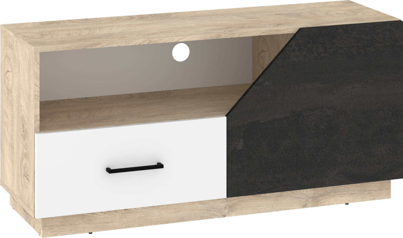 Stolek má 1 dvířka a 1 zásuvku na kovových pojezdech, kam schováte všechny věci, co potřebujete mít po ruce. Nad zásuvkou je otevřená nika s připraveným vývodem pro kabeláž.