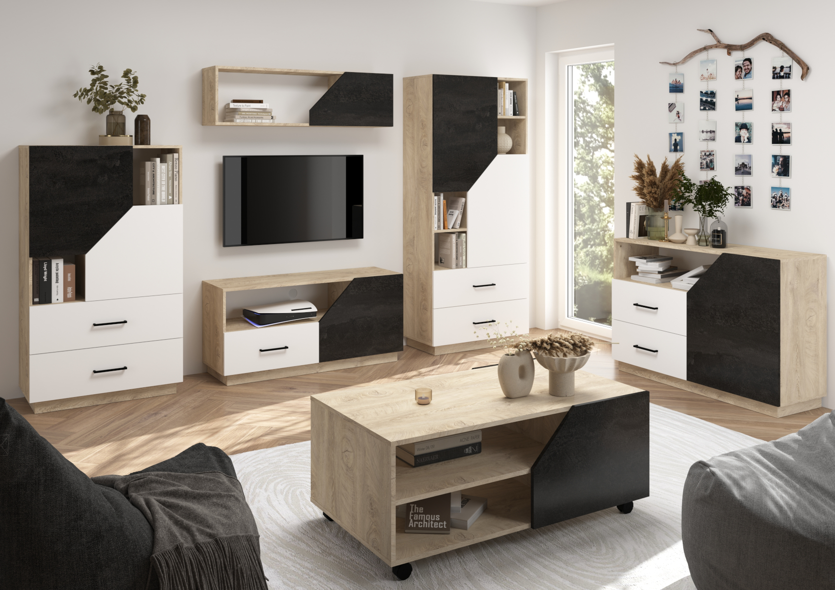 Televizní stolek Pax vás zaujme svým moderním designem a barevným provedením. Je vyroben z kvalitních lamino desek o síle 16 mm. Desky mají ABS hranění, které zvyšuje odolnost pro odštípnutí hran. Součástí zásuvek a dvířek jsou jednoduché černé kovové úchyty, zároveň mají zabudovaný systém tichého dovírání. Nábytek je vybaven soklem, který zvyšuje stabilitu nábytku. Nabízíme vám několik barevných kombinací.