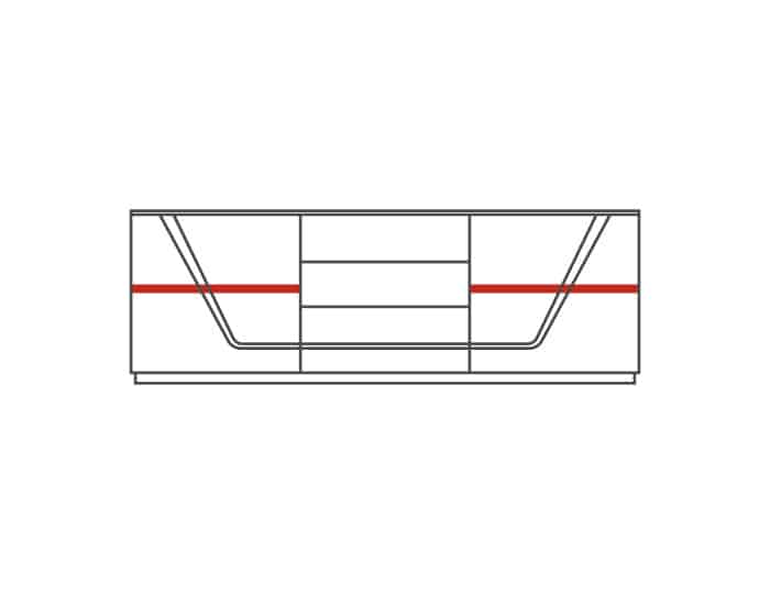 Televizní stolek má 2 krajní dvířka, za kterými jsou 2 malé lakované police. Uprostřed, ve spodní části, je zásuvka na kovových pojezdech a nad ní otevřená nika k uložení elektroniky.