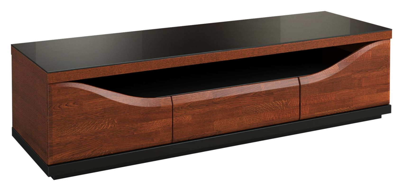 Moderní televizní stolek Vega maxi vás zaujme svým jednoduchým designem. Jedinečným prvkem jsou zvláštně tvarovaná dvířka ve tvaru jemné vlnky, které dodají nábytku nádech elegance. Stolek je vyroben z masivního dubového dřeva a přírodní dubové dýhy. Kvalitní technologie lakování a moření navodí přírodní vzhled dřeva a zvýrazní tak jeho léta. Nabízíme vám 2 varianty horní desky - dýha nebo sklo Lacobel. Dvířka i zásuvky v celém systému mají jednoduchý dotykový systém otevírání Push to open.