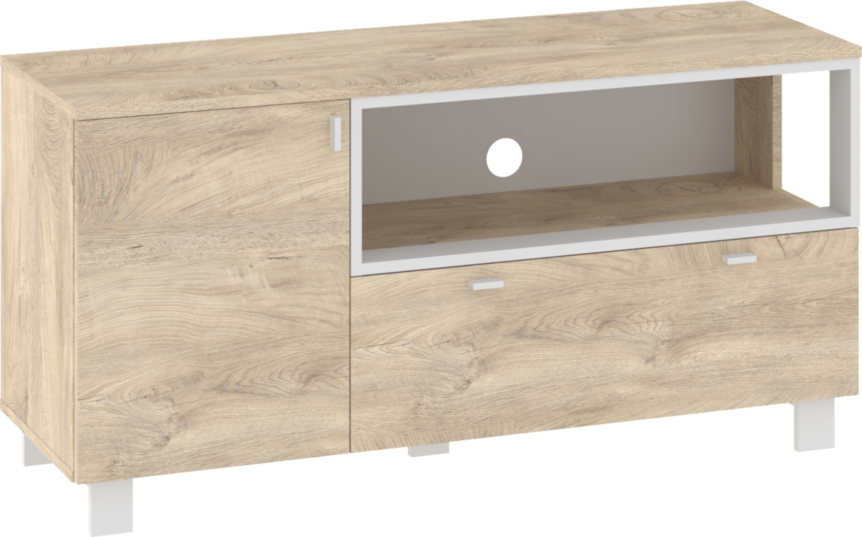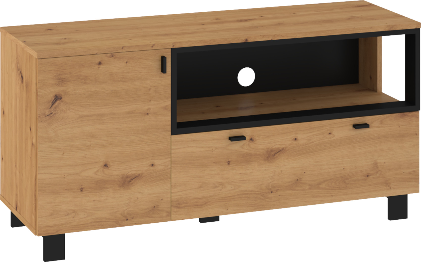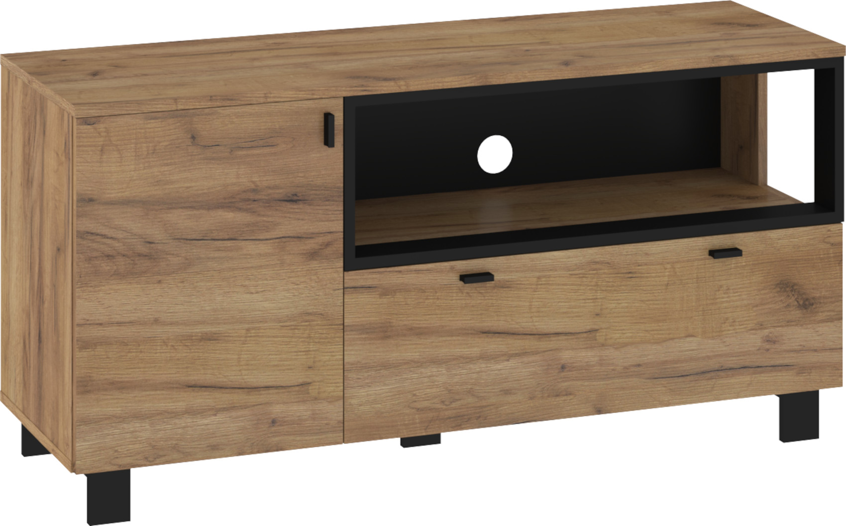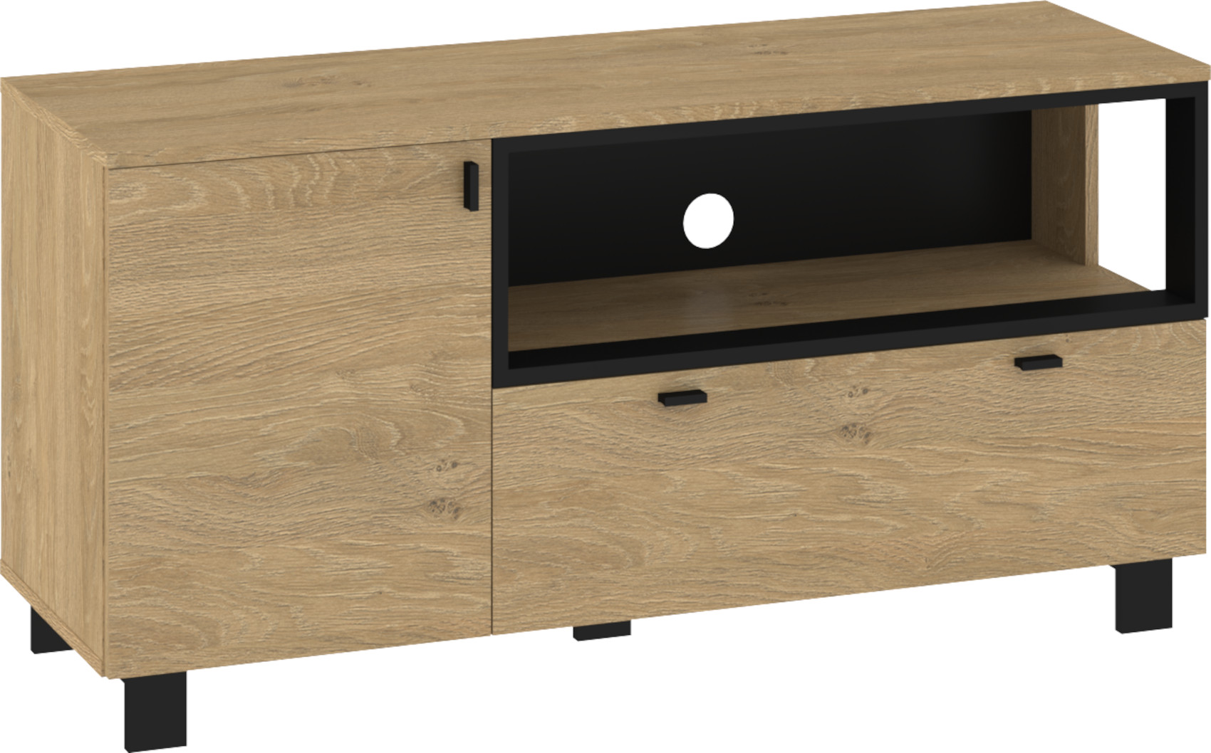 RTV stolek Vegas 12 vás zaujme svým moderním designem a přírodním provedením v kombinaci s černými či bílými detaily. Je vyroben z kvalitních lamino desek o síle 16 mm. Desky mají ABS hranění, které zvyšuje odolnost pro odštípnutí hran. Součástí zásuvek a dvířek jsou jednoduché černé kovové úchyty, zároveň mají zabudovaný systém tichého dovírání. Nábytek stojí na černých kovových nožkách o velikosti 8 cm, které provzdušní váš celkový prostor. Nabízíme vám několik barevných variant.