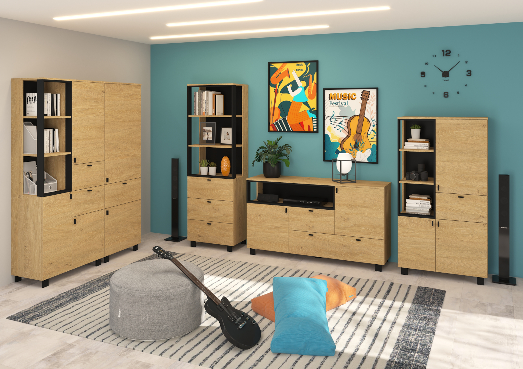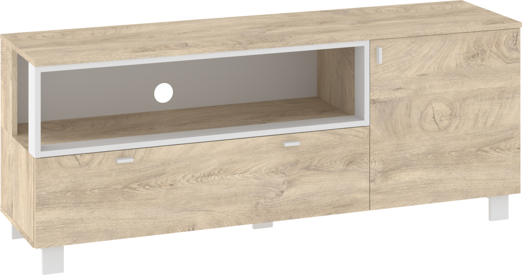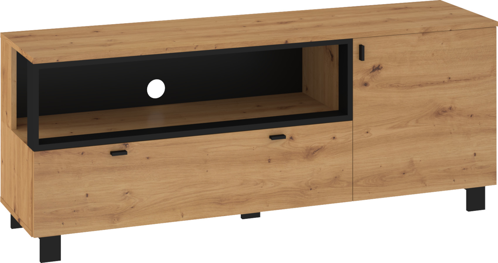 RTV stolek Vegas 13 vás zaujme svým moderním designem a přírodním provedením v kombinaci s černými či bílými detaily. Je vyroben z kvalitních lamino desek o síle 16 mm. Desky mají ABS hranění, které zvyšuje odolnost pro odštípnutí hran. Součástí zásuvek a dvířek jsou jednoduché černé kovové úchyty, zároveň mají zabudovaný systém tichého dovírání. Nábytek stojí na černých kovových nožkách o velikosti 8 cm, které provzdušní váš celkový prostor. Nabízíme vám několik barevných variant.