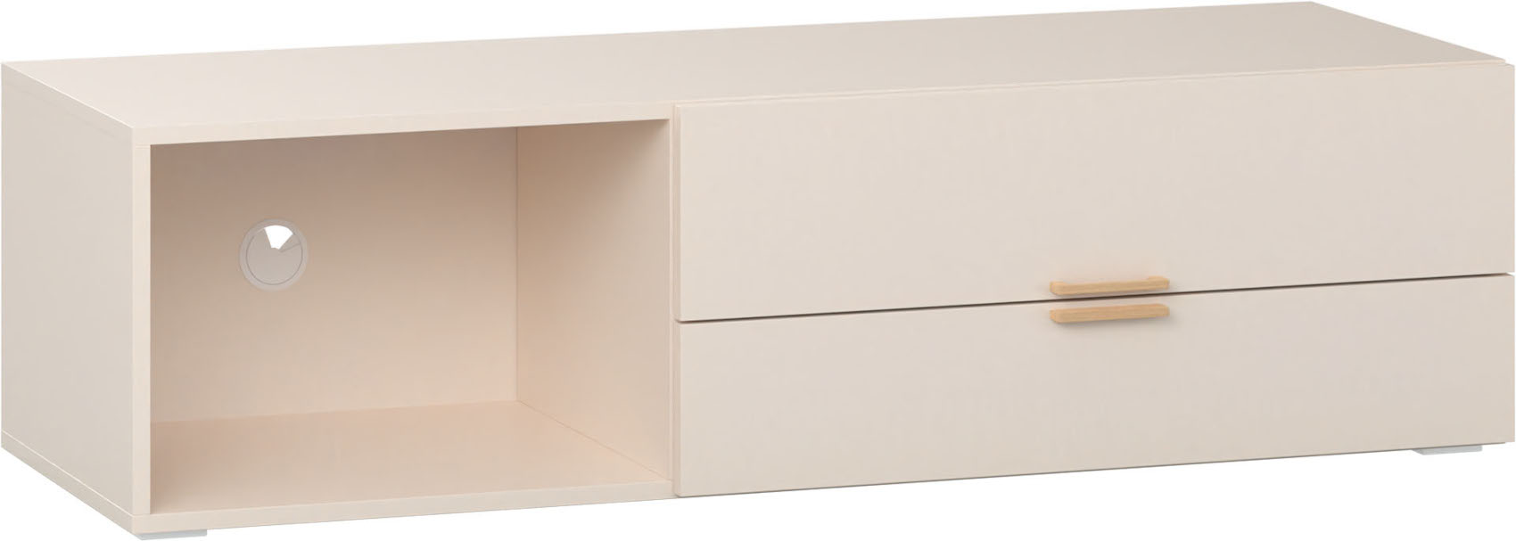 Malý televizní stolek 4You vás zaujme svým moderní designem v jasném odstínu. Je vyroben z kvalitního lamina odolného vůči poškrábání a nečistotám. Můžete si vybrat ze 2 odstínů úchytek - dub nebo bílá.