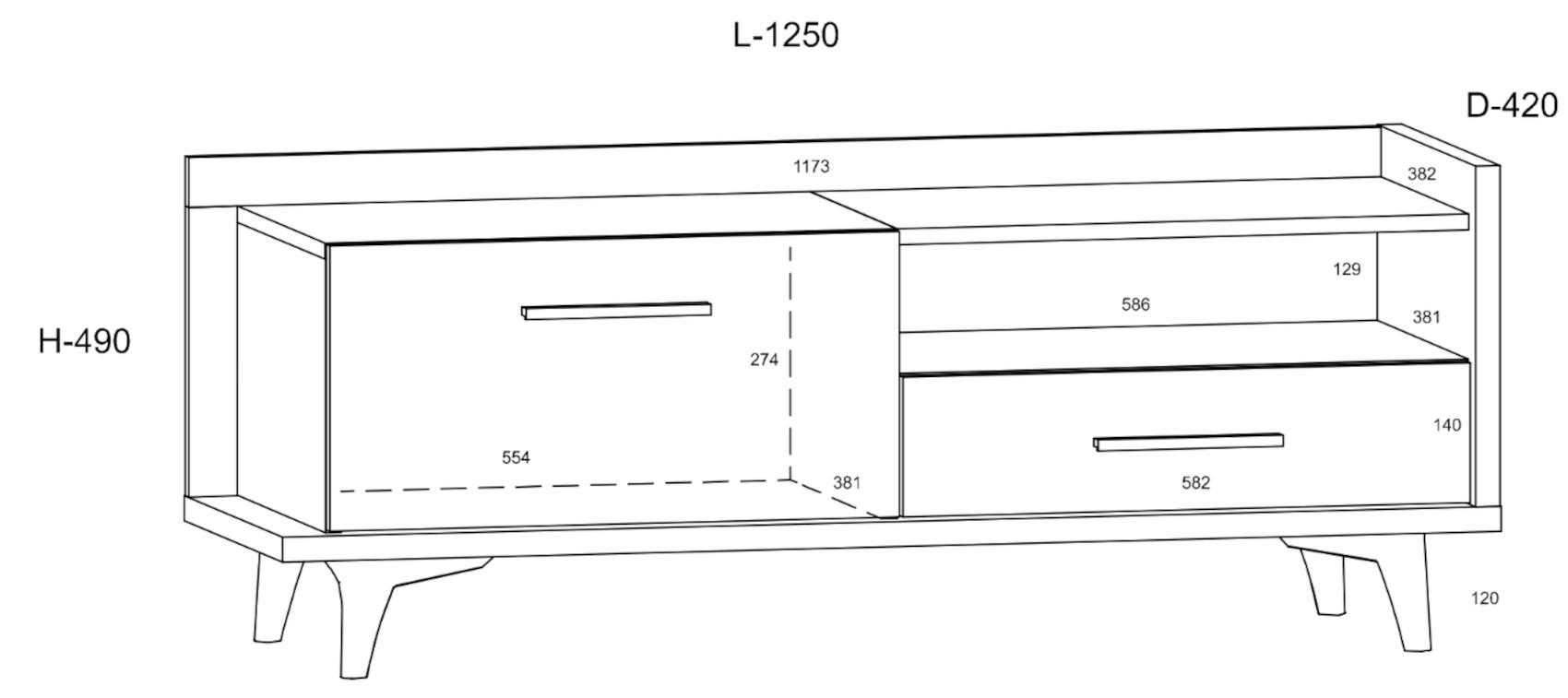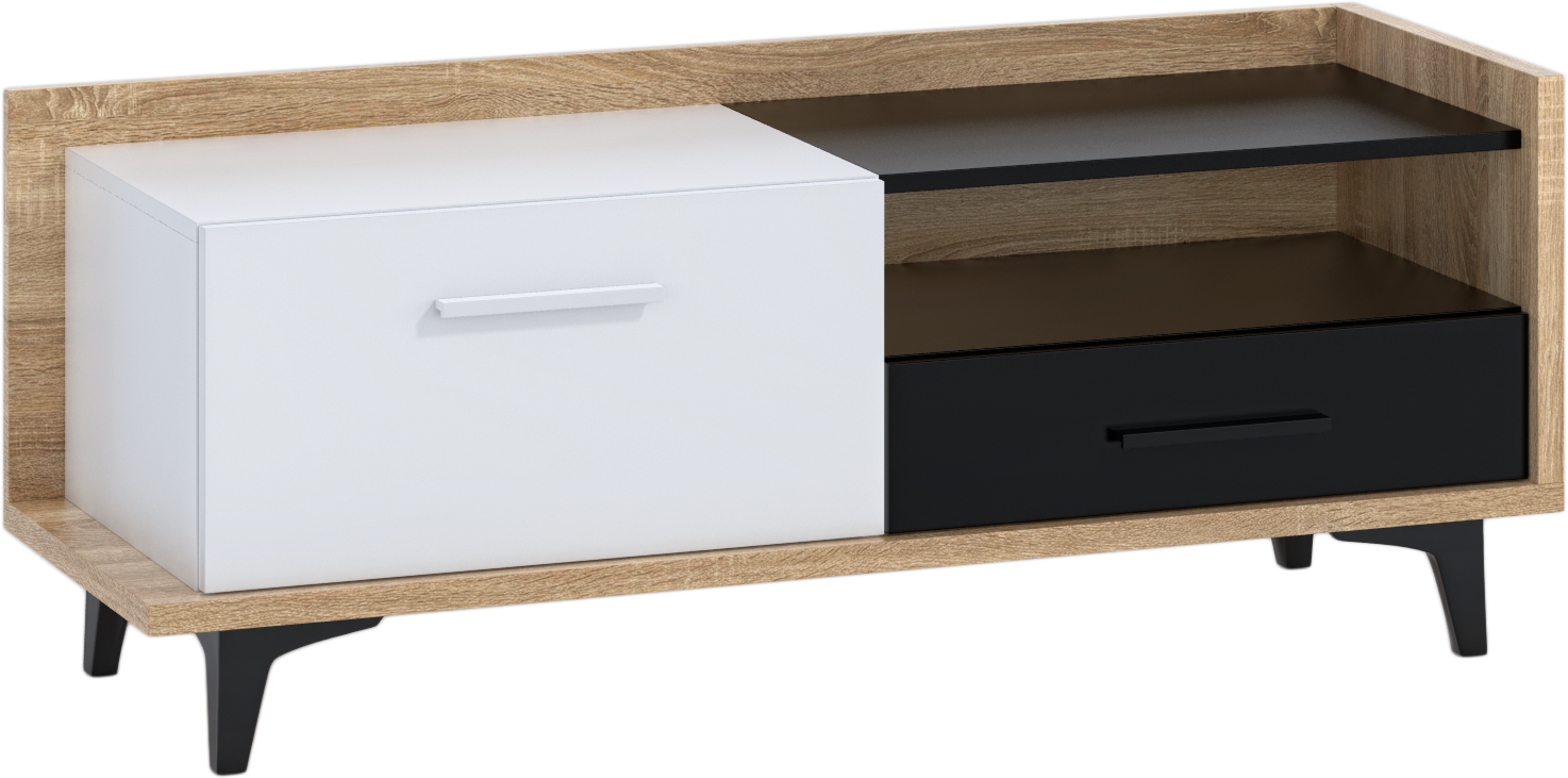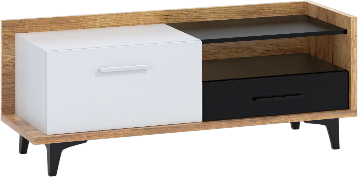Součástí TV stolku jsou 1 dvířka a 1 zásuvka na kovových pojezdech. V horní pravé části je otevření nika k uložení elektroniky.