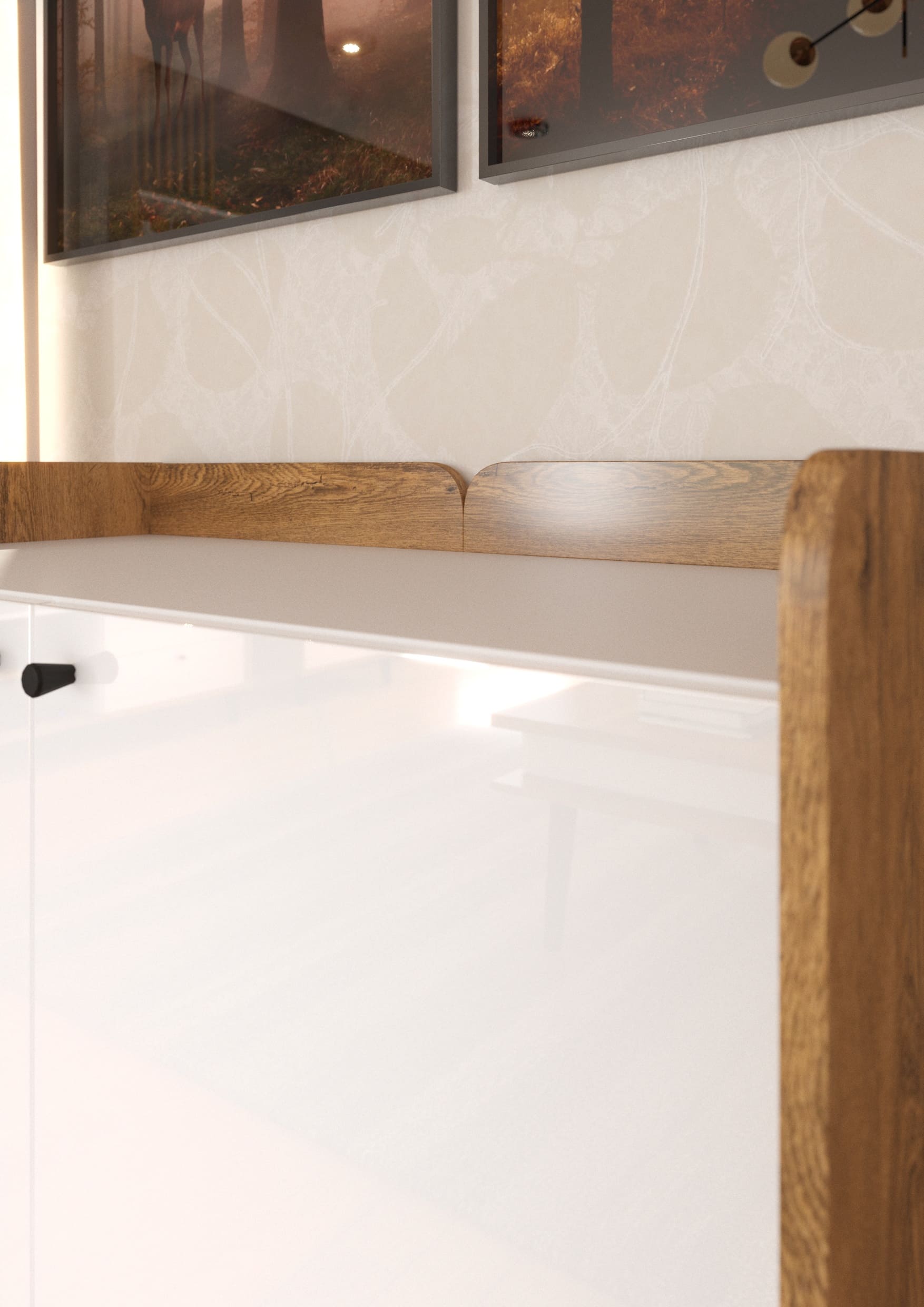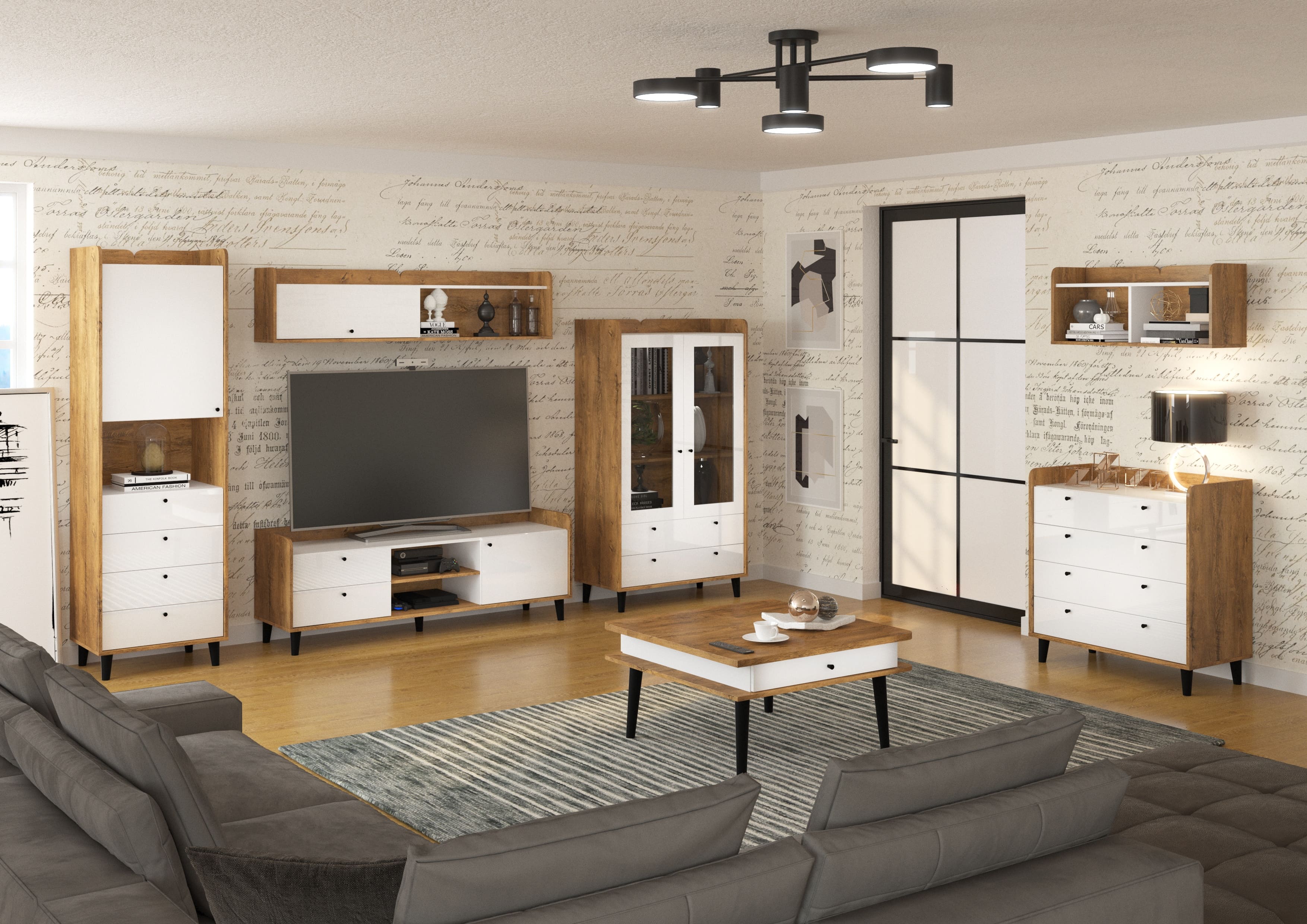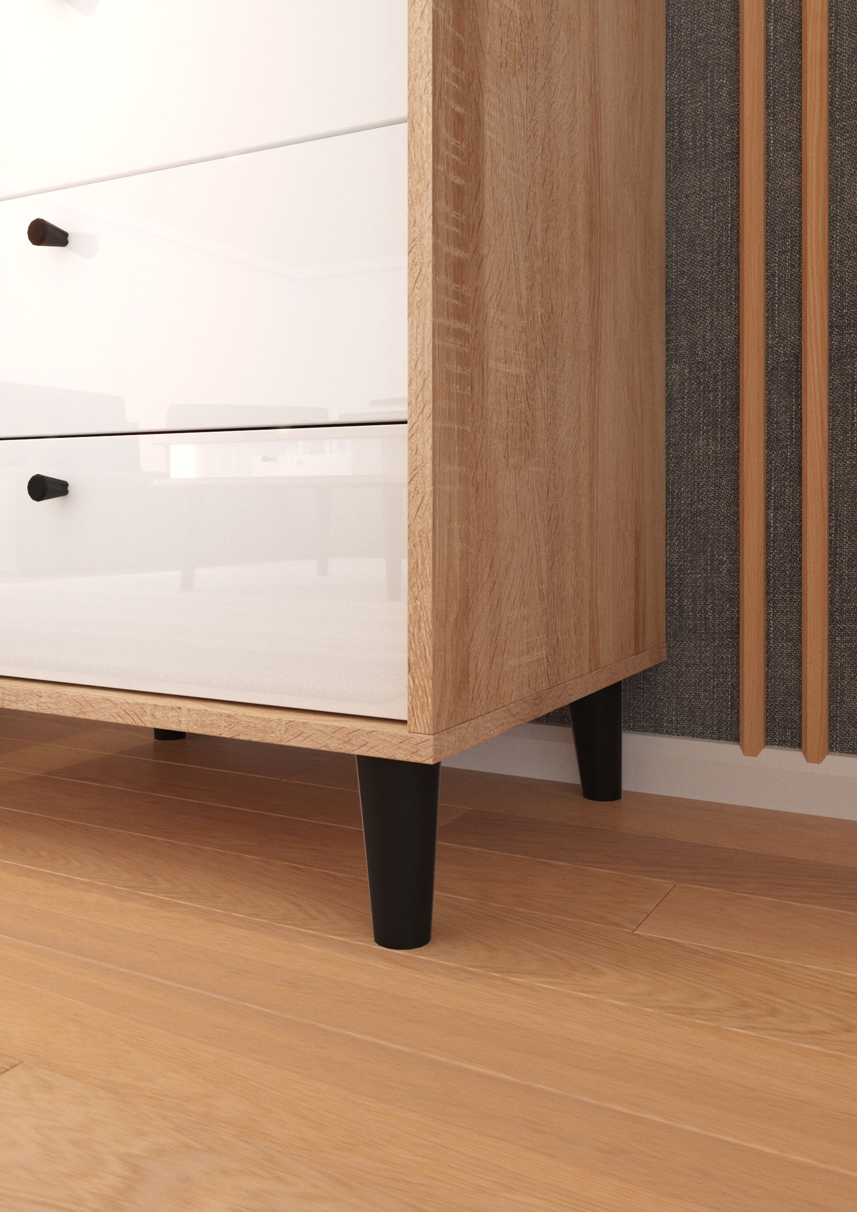 Výrazným prvkem jsou černé dřevěné nožky různých výšek, které dodají celé kolekci originální vzhled. A nejen to, vyšší nožky jsou také praktické při uklízení. Vitríny jsou vybavené kouřovými skly, které ještě více zdůrazní originální vzhled systému. Černou barvu mají i úchyty a spolu s bílým leskem na předních plochách skvěle doplňují dřevodekory reflektující moderní trendy v bydlení. S kolekcí Dolce nemůžete šlápnout vedle!