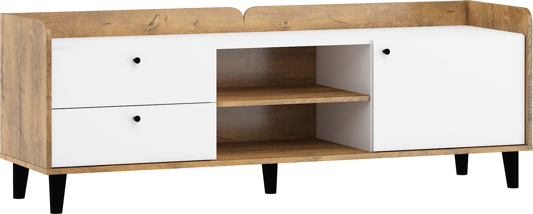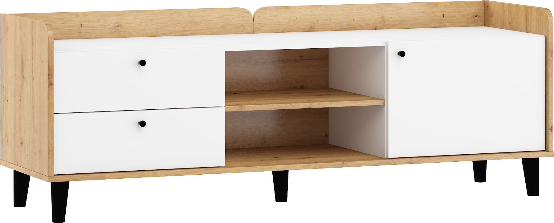 Televizní stolek Dolce 17 splňuje nároky na funkčnost i estetiku. Stolek disponuje 2 praktickými zásuvkami na kovových pojezdech, policovou částí a skříňkou.