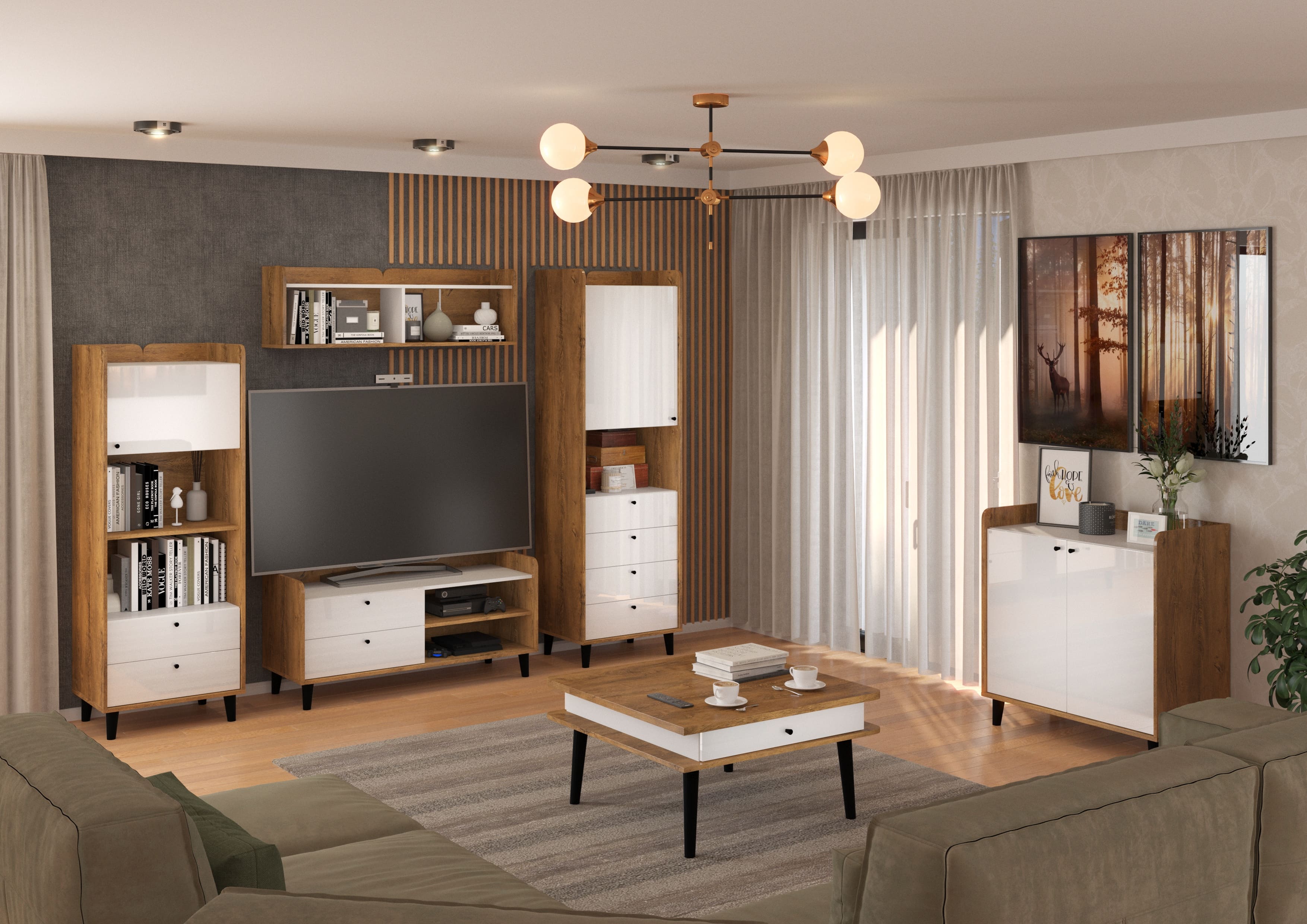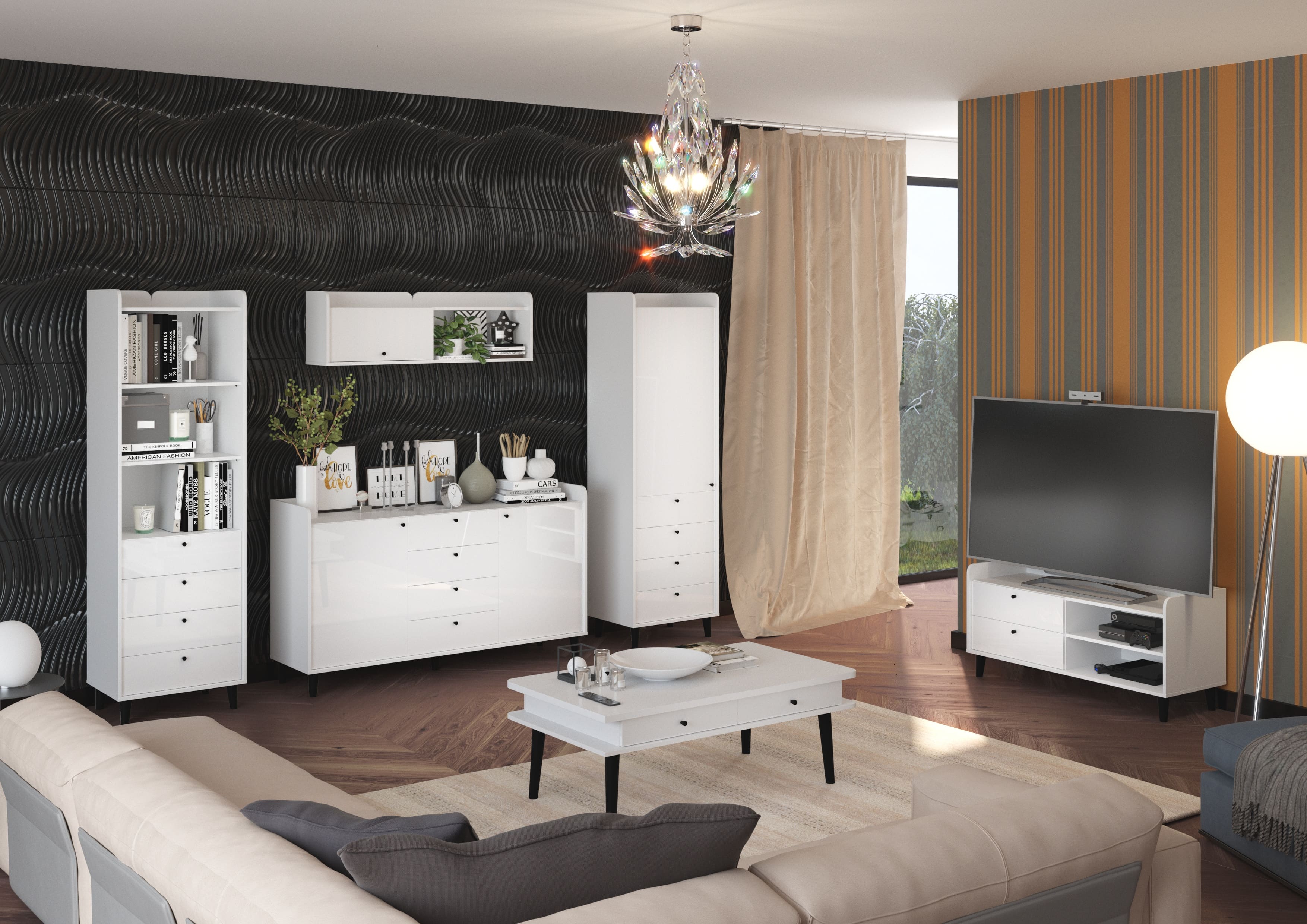 Výrazným prvkem jsou černé dřevěné nožky různých výšek, které dodají celé kolekci originální vzhled. A nejen to, vyšší nožky jsou také praktické při uklízení. Vitríny jsou vybavené kouřovými skly, které ještě více zdůrazní originální vzhled systému. Černou barvu mají i úchyty a spolu s bílým leskem na předních plochách skvěle doplňují dřevodekory reflektující moderní trendy v bydlení. S kolekcí Dolce nemůžete šlápnout vedle!