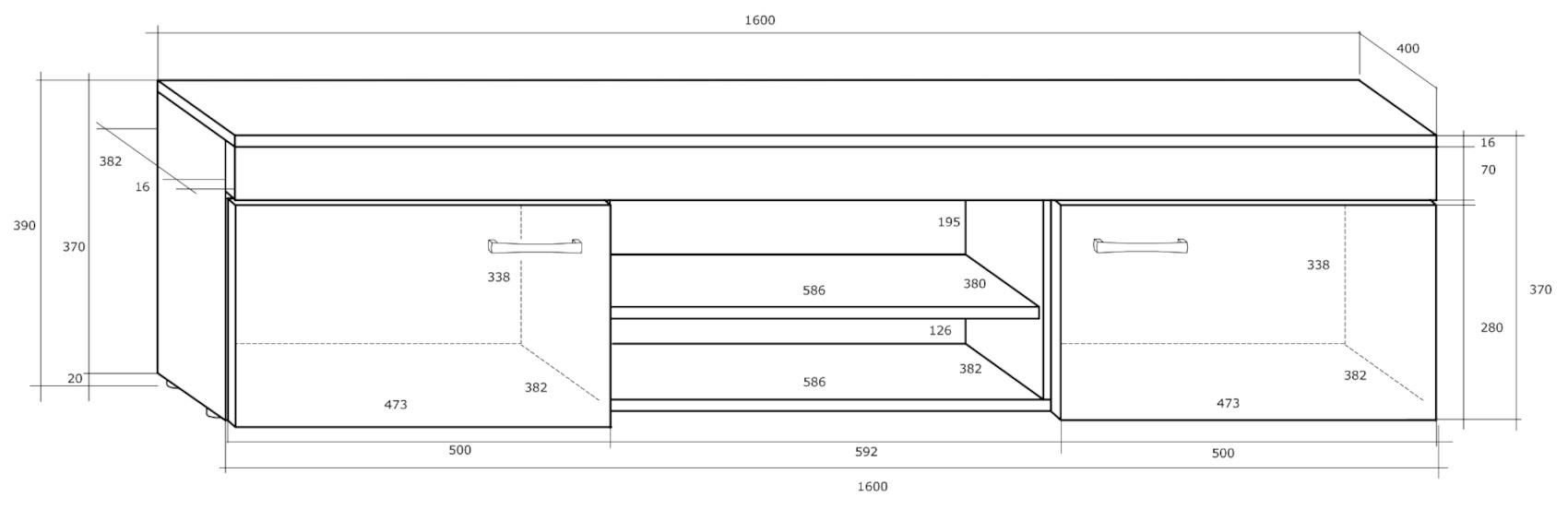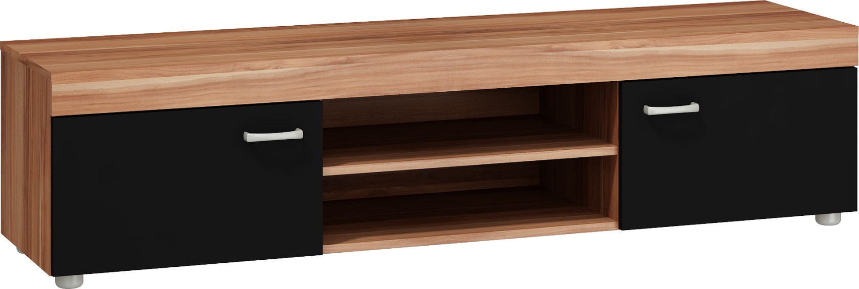 Součástí komody jsou 2 plná krajní dvířka. Uprostřed jsou 2 otevřené niky k uložení elektroniky či jiných nezbytností.