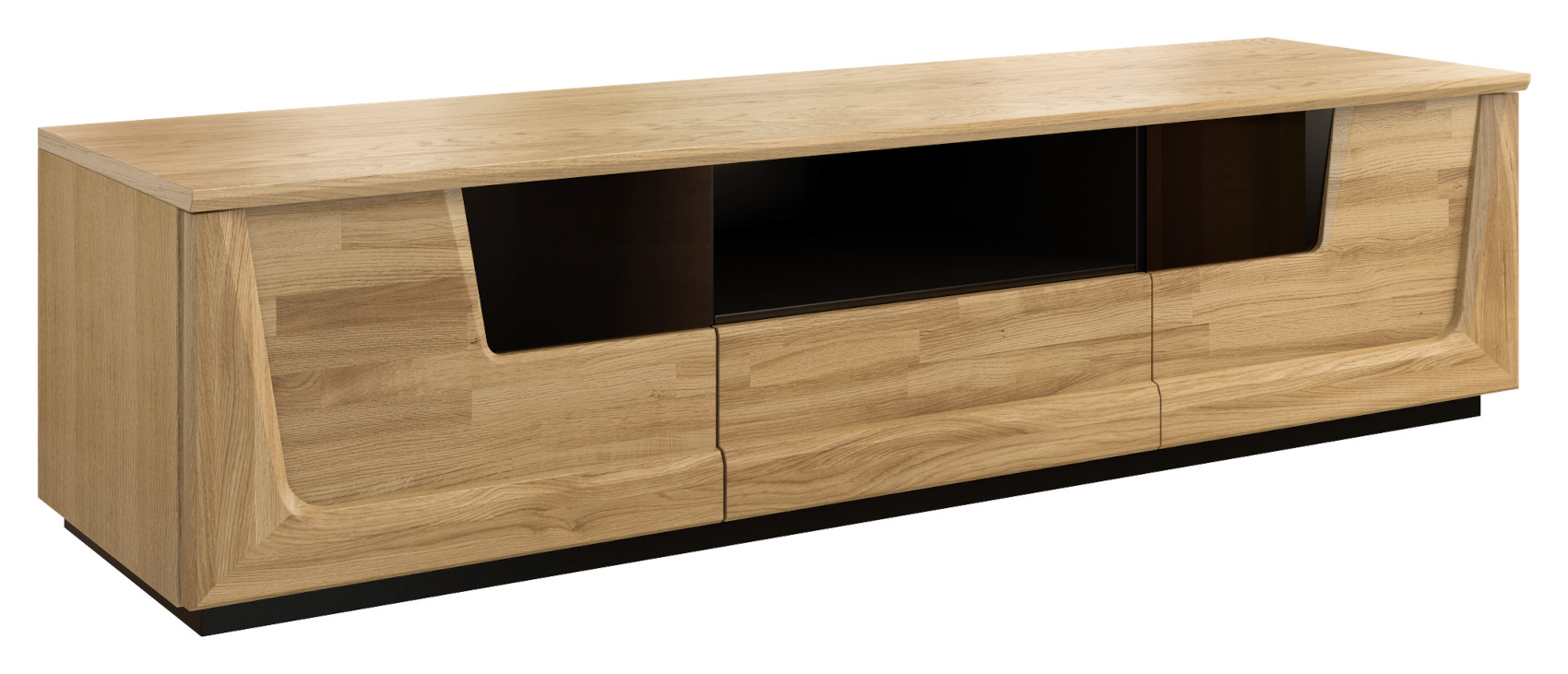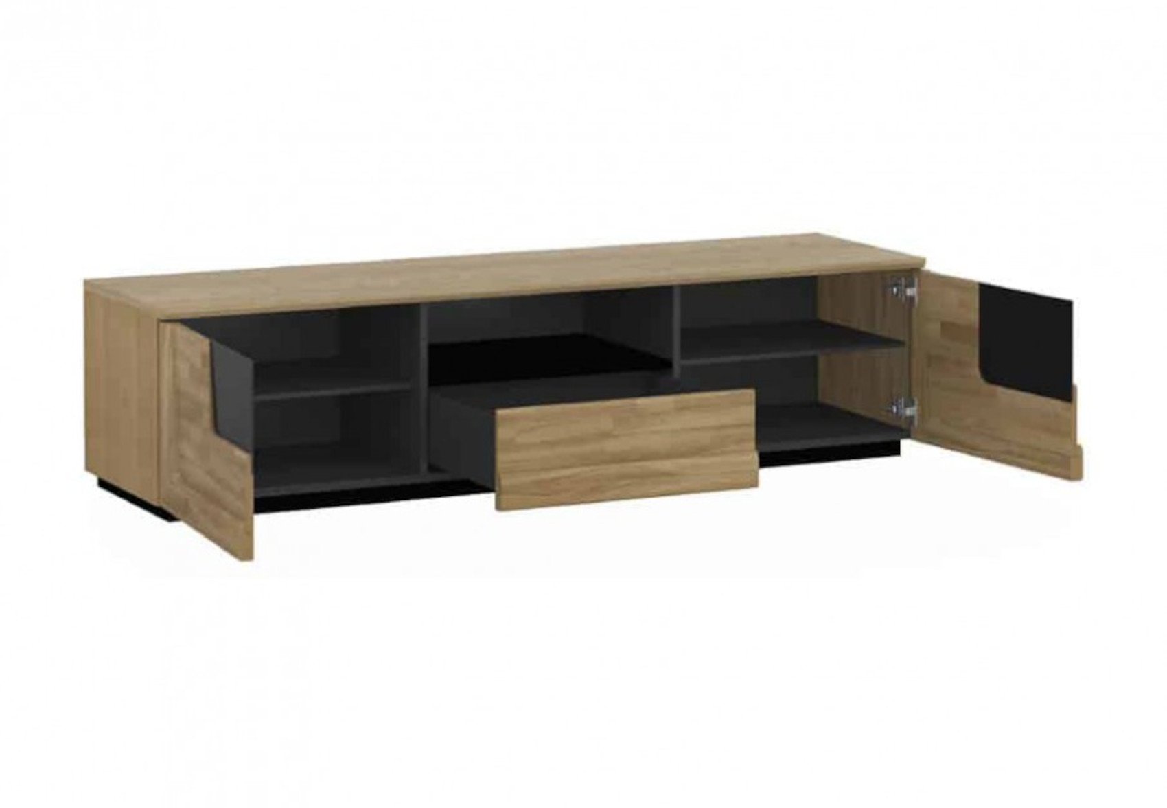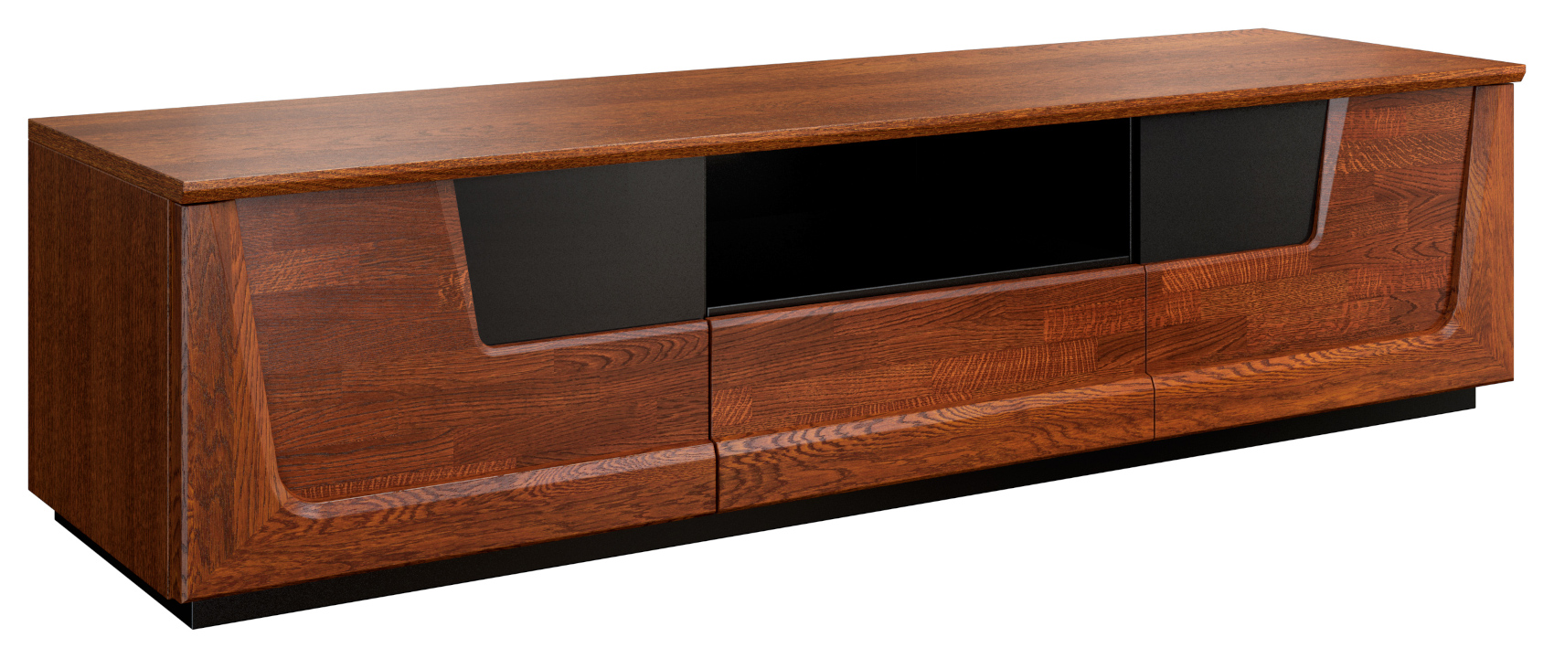 Televizní stolek Maganda maxi vás zaujme svým moderním a luxusním designem. Je vyroben z masivního dubového dřeva s černými detaily ze skla Lacobel. Vzhledem k použitému materiálu se jedná o stabilní nábytek. Kvalitní technologie lakování a moření dodává nábytku přírodní vzhled a zvýrazňuje jeho léta. Máte možnost si vybrat ze 2 barevných variací moření dřeva.