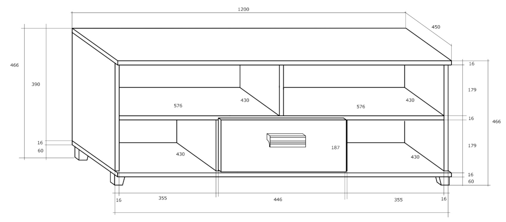Součástí jsou 4 otevřené niky k uložení elekroniky či jiných nezbytností. Ve spodní prostřední části je zásuvka na kovových pojezdech.