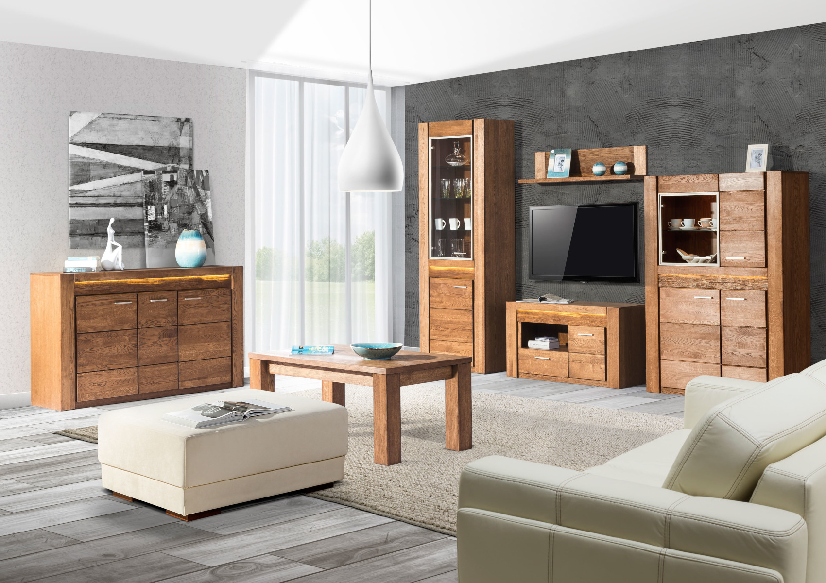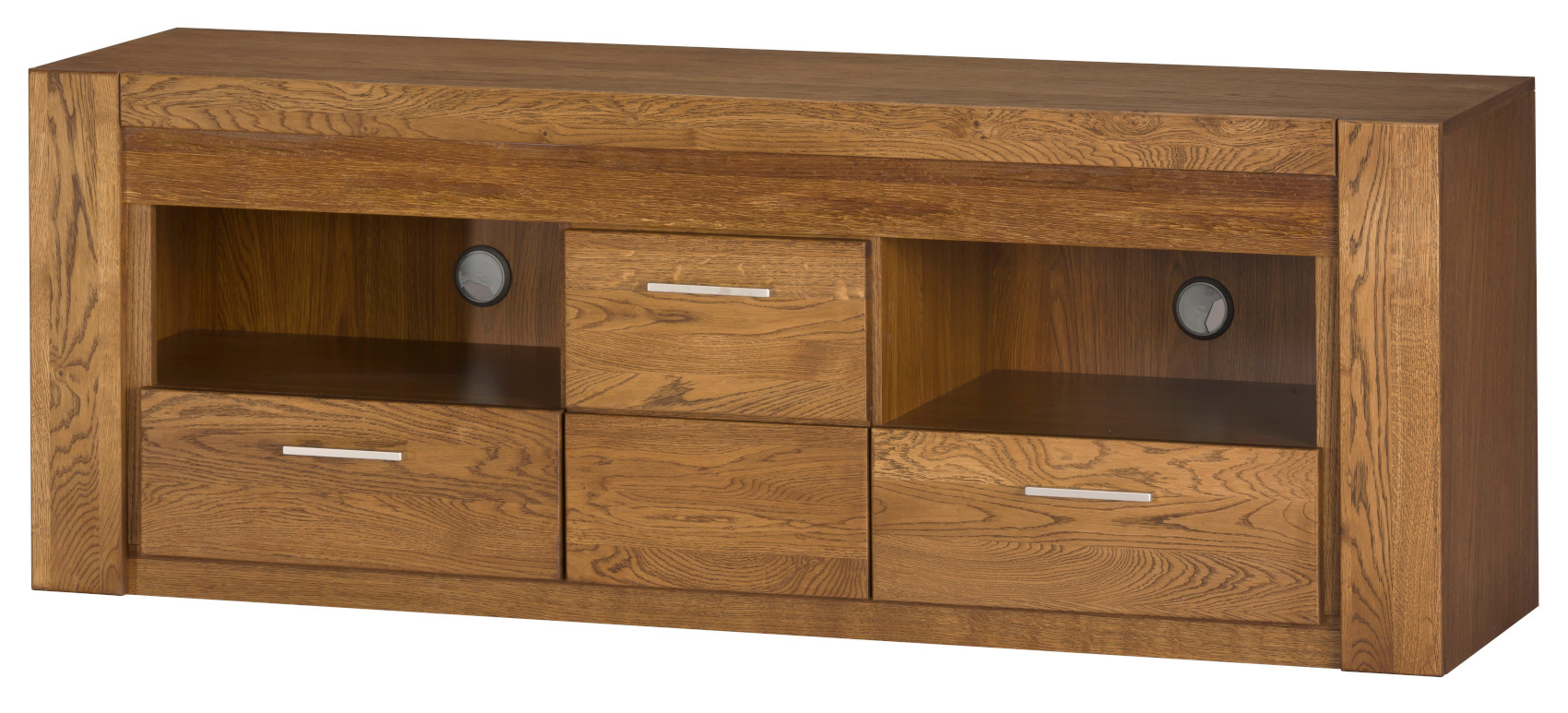 Moderní televizní stolek Velvet 25 vás zaujme svým elegantním a přírodním designem s viditelnou strukturou dřevěných lét. Přední část stolku je vyrobena z masivního dubového dřeva a korpus z přírodní dubové dýhy. Veškerá dvířka i zásuvky mají kovové úchyty. Jedinečným prvkem celého systému je LED osvětlení pod horní deskou, které dodá nábytku nádech luxusu.