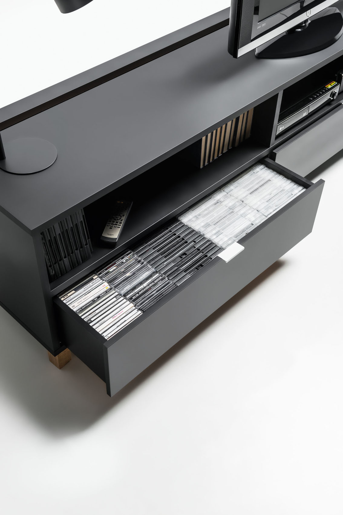 Ve spodní části jsou 2 zásuvky na kovových pojezdech a nad nimi 2 otevřené niky s připravenými vývody pro kabeláž.