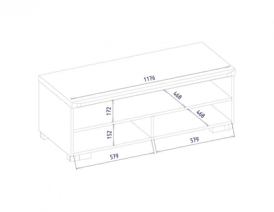 Televizní stole má 2 plná dvířka, za kterými je vložena 1 dlouhá lakovaná police. V horní části je otevřená nika k uložení elekroniky.
