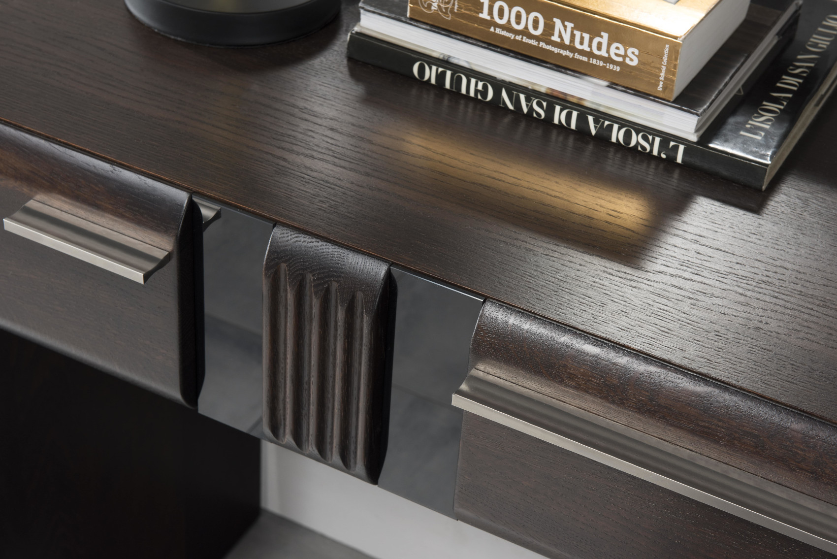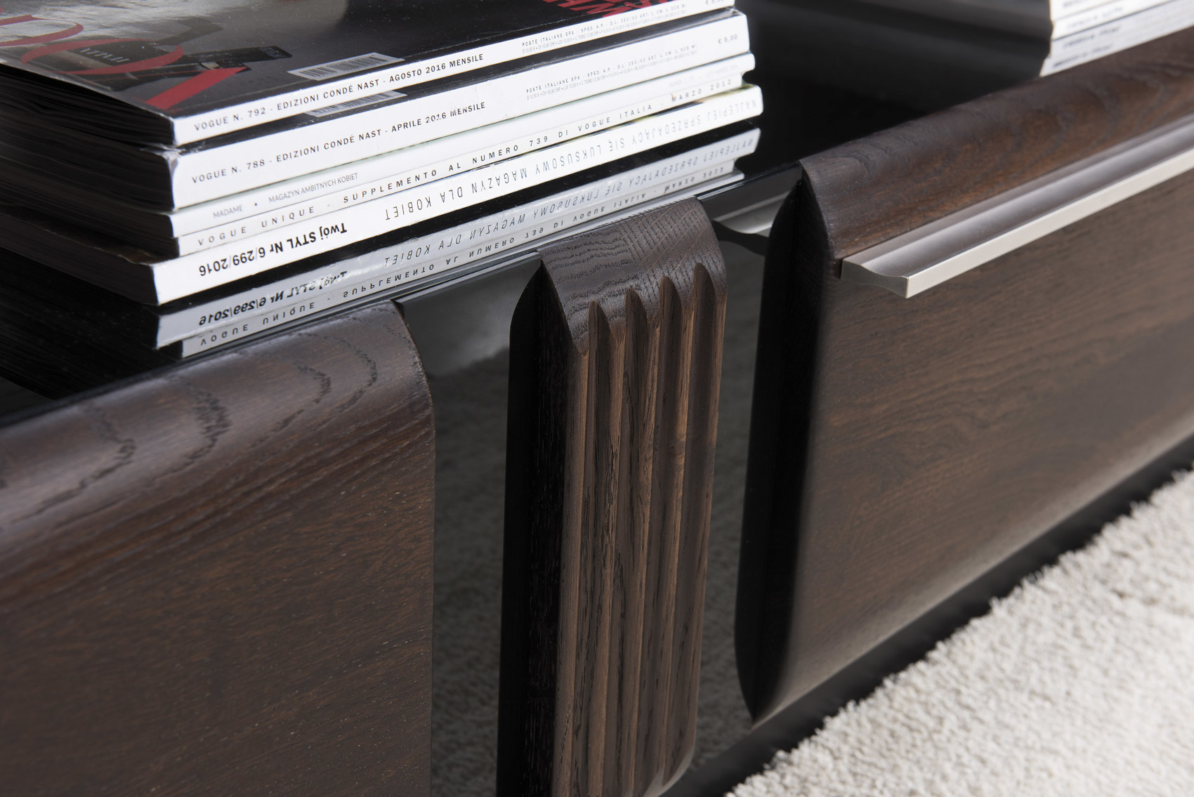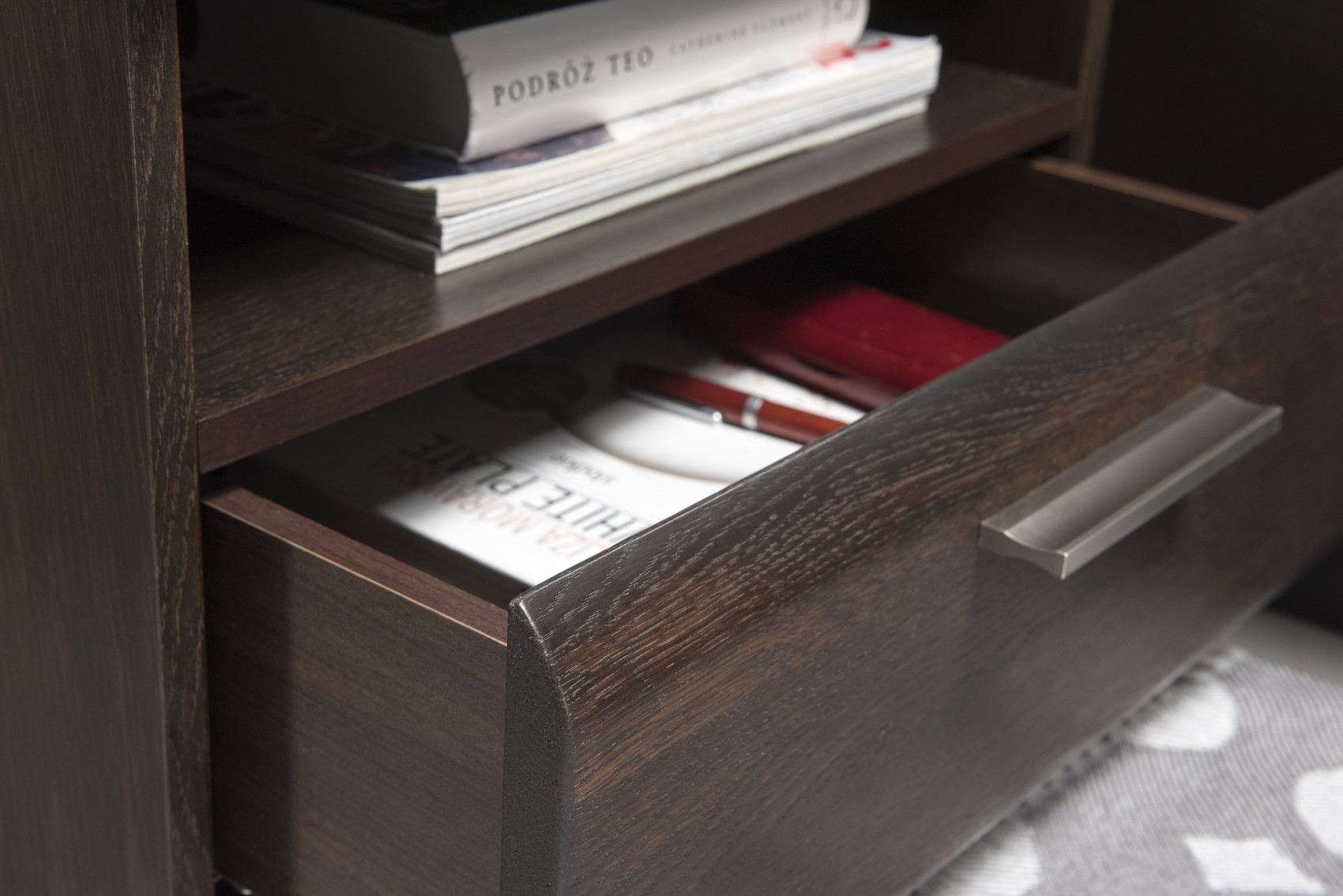 Moderní TV stolek Porti 25 vás zaujme svým luxusním designem. Přední část je vyrobena z masivního dubového dřeva s černými skleněnými detaily a korpus je z přírodní dubové dýhy. Celý systém Porti má kovové úchytky. Máte na výběr ze 2 barevných variant.