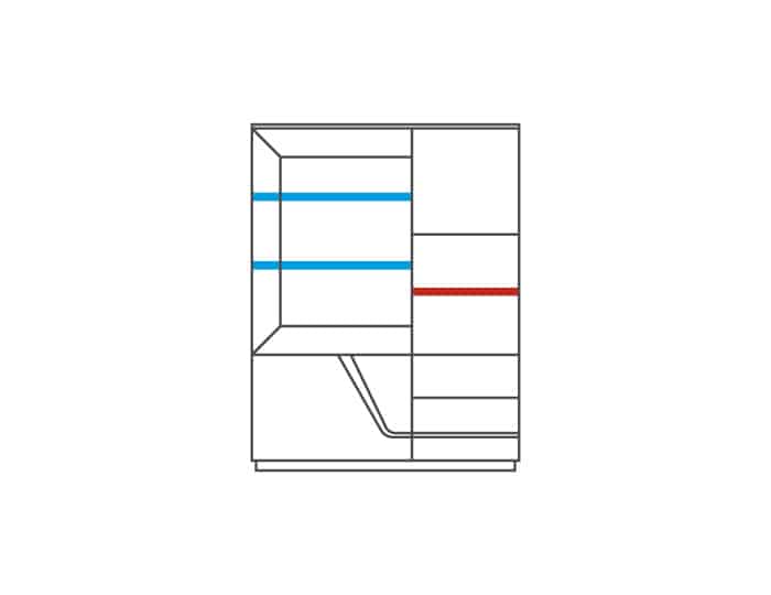 Skříňka má 3 plná dvířka, kterými je 1 lakovaná police. Vedle nich jsou prosklená dvířka sklem Antisol se 2 skleněnými policemi. Skleněné police mají LED osvětlení, které dodá nábytku nádech elegance. Ve spodní části jsou 2 zásuvky na kovových pojezdech.