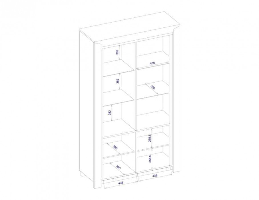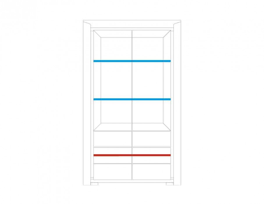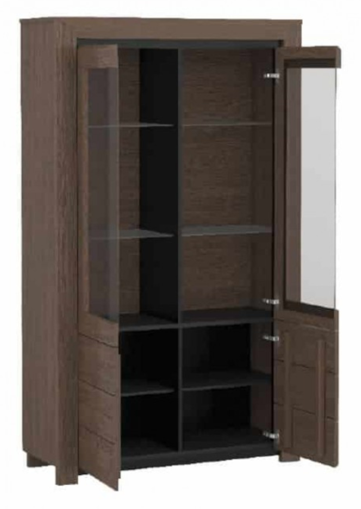 Vitrína je rozdělena do 2 částí. V horní prosklené části jsou 4 skleněné police s LED podsvícením, které dodají nábytku nádech luxusu. Spodní část má plná dvířka s 2 dřevěnými policemi.