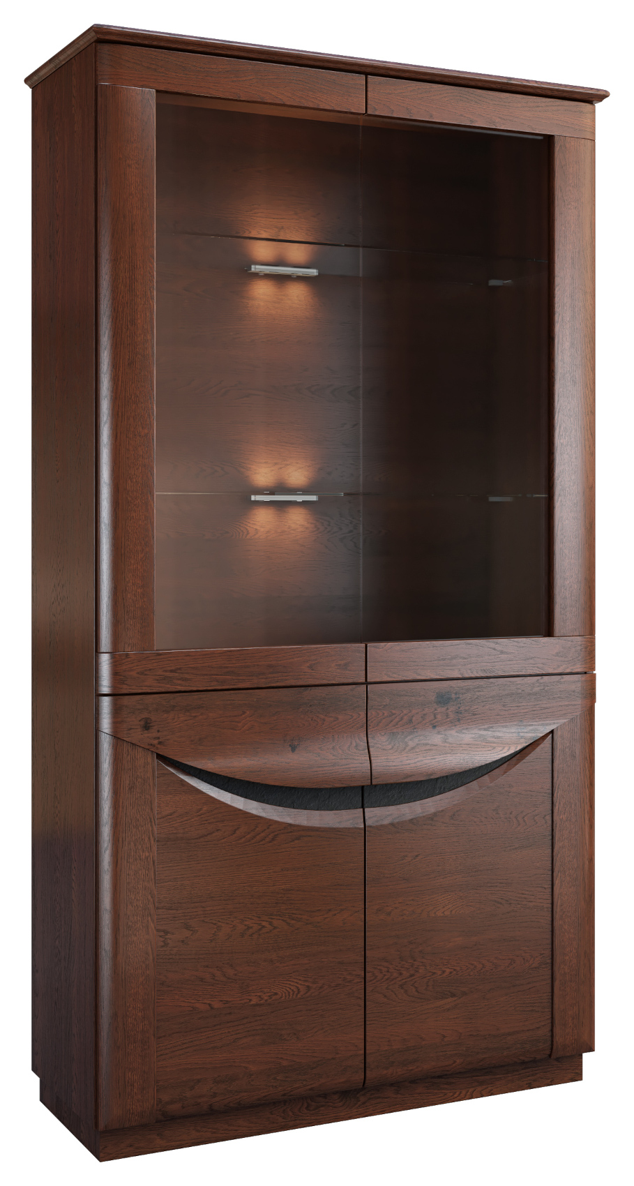 Dvojitá vitrína Bari vás zaujme svým elegantním designem. Je vyrobena z masivního dubového dřeva a přírodní dubové dýhy. Kvalitní lakování a mořená dodává nábytku přírodní vzhled dřeva a zvýrazňuje strukturu lét. Jedinečným prvkem celé kolekce jsou vyřezávané dekorační prvky na dvířkách v 5 odstínech - burgundský dub, beton, rez, černá (magma) a ocel.