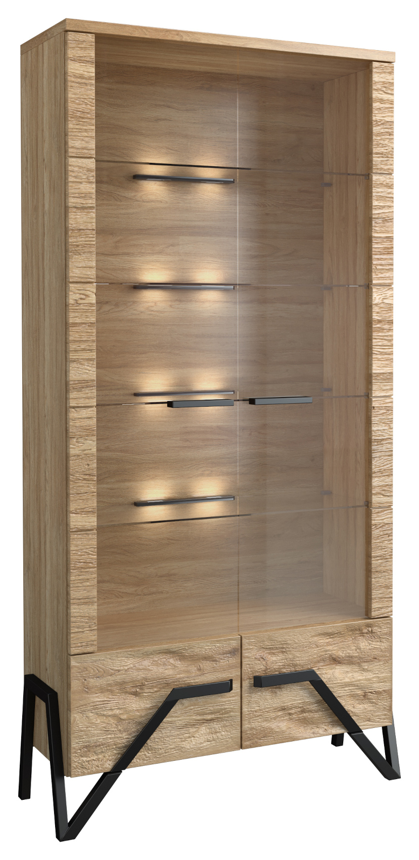 Vitrína má 2 prosklené dveře, za kterými jsou vloženy 4 skleněné police. Police jsou doplněny LED podsvícením, které dodá nábytku nádech elegance, luxusu a zpříjemní vám večerní atmosféru.