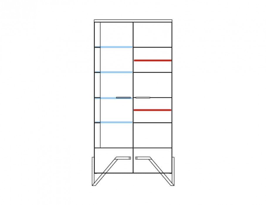 Vitrína má 1 prosklená a 1 plná dvířka. Za prosklenými dvířky jsou vloženy 4 skleněné police a za plnými 2 lakované police. Skleněné police jsou doplněny LED podsvícením, které dodá nábytku nádech luxusu a večer navodí příjemnou intimní atmosféru.